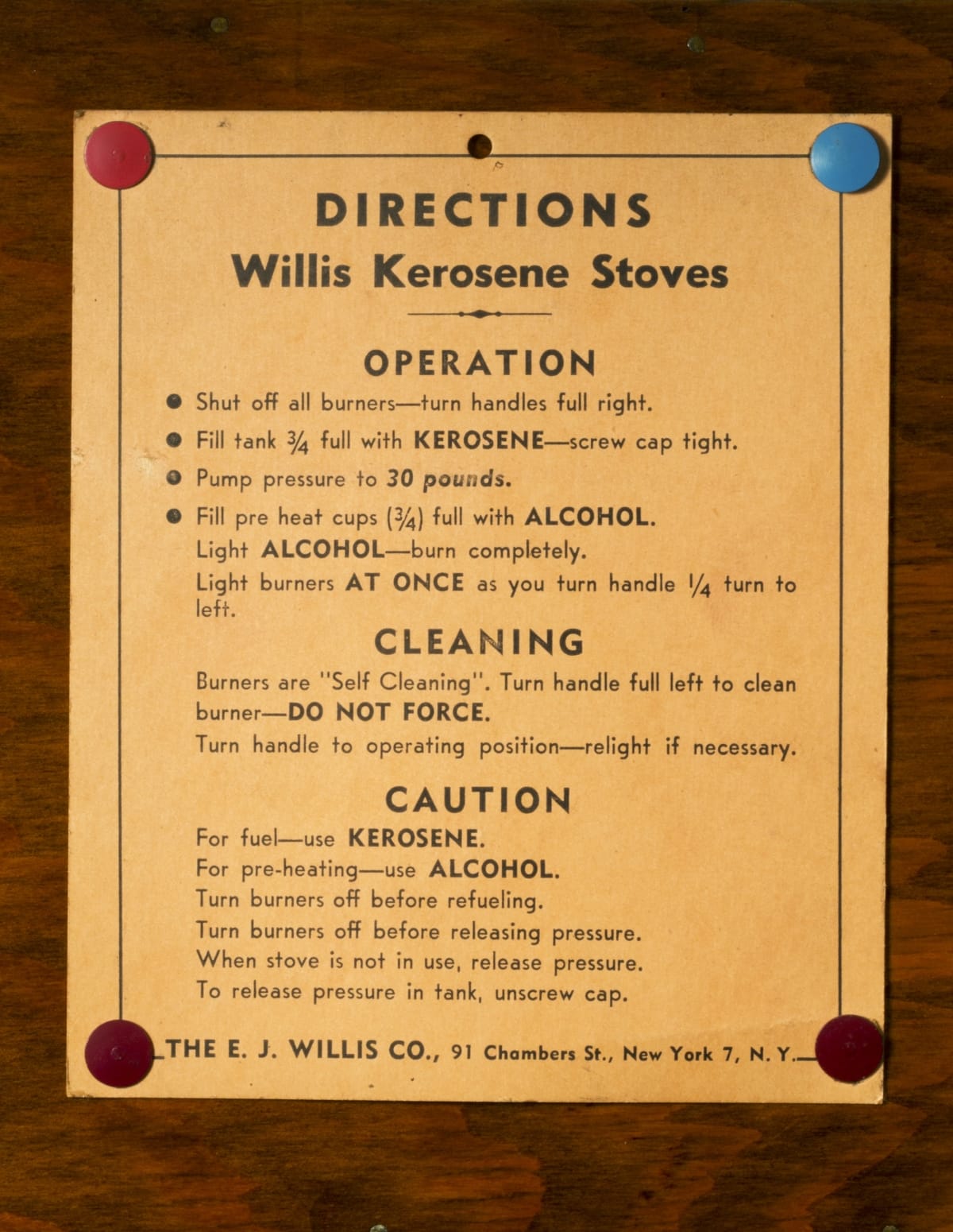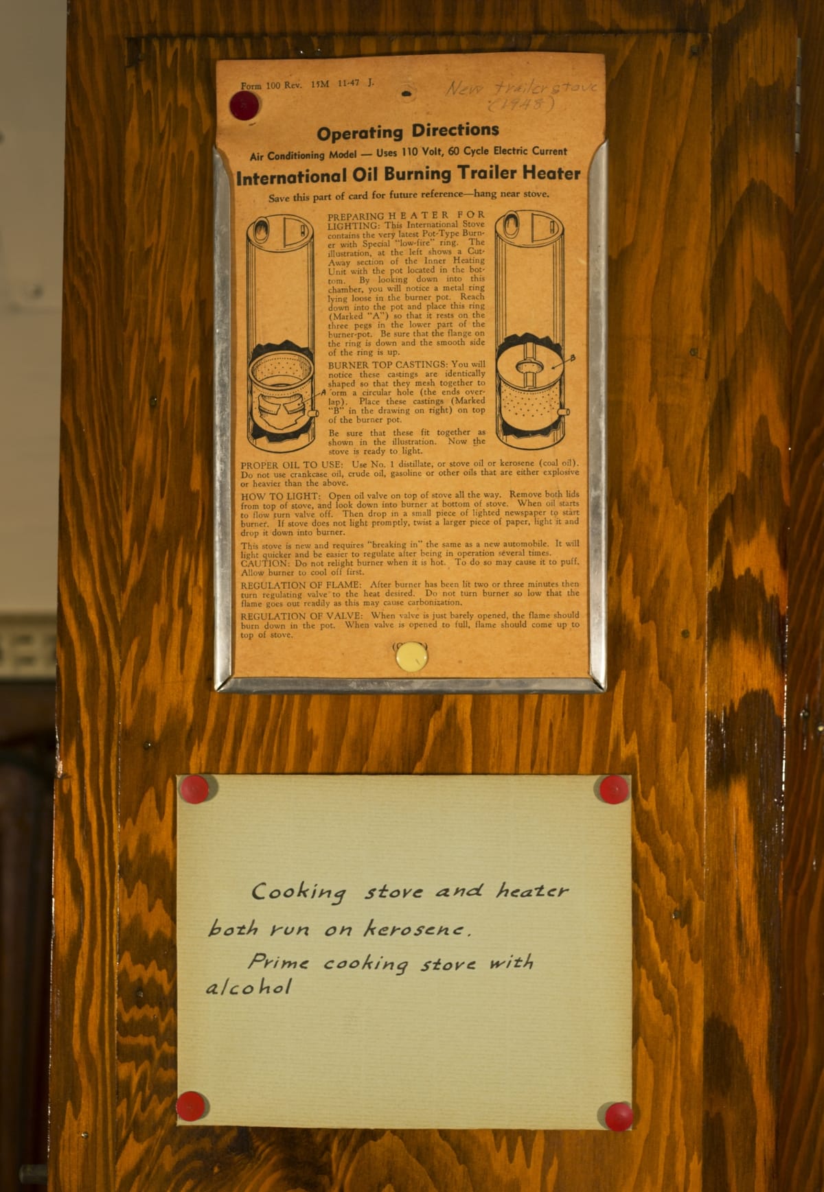 The following is handwritten on the bottom of a kitchen drawer in the trailer, by (most likely) Charles A. Lindbergh: TRAILER TRIPS- STATES DRIVEN THROUGH MICHIGAN - 1942 (A.M.L. & C.A.L) CONNECTICUT - 1944 (A.M.L & CAL) MASSACHUSETTS - 1945 (A.M.L., C.A.L., JON & LAND) NEW HAMPSHIRE - 1945 (A.M.L., C.A.L., JON & LAND) MAINE - 1945 (A.M.L., C.A.L., JON & LAND) NEW YORK - 1946 (A.M.L. & C.A.L.) NEW JERSEY - 1946 (A.M.L. & C.A.L.) PENNSYLVANIA - 1946 (A.M.L. & C.A.L.) MARYLAND - 1946 (A.M.L. & C.A.L.) VIRGINIA - 1946 (A.M.L. & C.A.L.) NORTH CAROLINA - 1946 (A.M.L. & C.A.L.) SOUTH CAROLINA - 1946 (A.M.L. & C.A.L.) GEORGIA - 1946 (A.M.L. & C.A.L.) FLORIDA - 1946 (A.M.L. & C.A.L.) (KEY WEST) DISTRICT OF COLUMBIA - 1946 (A.M.L. & C.A.L.) DELAWARE - 1946 (A.M.L. & C.A.L.) WEST VIRGINIA - 1947 (C.A.L.) (& AML-'47) OHIO - 1947 (C.A.L.) INDIANA - 1947 (C.A.L.) MISSOURI - 1947 (C.A.L.) KANSAS - 1947 (C.A.L.) OKLAHOMA - 1947 (C.A.L.) TEXAS - 1947 (C.A.L.) (& AML-'47) NEW MEXICO - 1947 (C.A.L.) (& AML-'47) ARIZONA - 1947 (A.M.L. & C.A.L.) / UTAH - 1947 (AML & CAL) NEVADA - 1947 (AML & CAL) CALIFORNIA - 1947 (AML & CAL) OREGON - 1947 (AML & C.A.L.) WASHINGTON - 1947 (A.M.L. & CAL) IDAHO - 1947 (AML & CAL) COLORADO - 1947 (AML & CAL) / LOUISIANA - 1947 (AML & CAL) MISSISSIPPI - 1947 (AML & CAL) ALABAMA - 1947 (AML & CAL) TENNESSEE - 1947 (AML & CAL) KENTUCKY - 1952 (CAL) FLORIDA - 1952 (AML, LAND, ANNE, SCOTT, REEVE. CANADA - 1957 - (CHL & CAL) ONTARIO / THIS TRAILER WAS ONCE OWNED, AND USED AS AN EXPERIMENT IN TRANSPORTATION BY HENRY FORD. IT WAS EXHIBITED IN THE EDISON INSTITUTE, DEARBORN FOR A NUMBER OF YEARS TO DEMONSTRATE FUTURE POSSIBILITIES OF MOTOR TRANSPORT. IT WAS GIVEN TO US BY HENRY FORD IN THE FALL OF 1942 WHEN HE LEARNED THAT WE WERE PLANNING TO BUY A TRAILER TO PLACE SOME DISTANCE FROM OUR HOUSE AS A RETREAT IN WHICH WE COULD WRITE AND STUDY WITHOUT DISTURBANCE. YEAR - LOCATION 1942 - BELKNAP PROPERTY, BLOOMFIELD HILLS, MICH. 1943 - " " " " " " " " 1943 - PATTERSON PROPERTY, BLOOMFIELD HILLS, MICH. 1944 - " " " " " " " " 1944 - TOMPKINS PROPERTY, WESTPORT, CONN. 1945 - " " " " " " " " 1946 - " " " " " " " " 1946 - SCOTTS COVE, DARIEN, CONN. 1946 - CONTENTMENT ISLAND, DARIEN, CONN. 1947 - " " " " " " 1947 - SCOTTS COVE, DARIEN, CONN. [AML = Anne Morrow Lindbergh; CAL = Charles Augustus Lindbergh; Jon Lindbergh (b.1932), Land Morrow Lindbergh (b.1937); Anne Lindbergh (b.1940), Scott Lindbergh (b.1942) and Reeve Lindbergh (b.1945).] Marked on trailer hitch: 150 SLIMP. K in diamond Decal on right door of upper sink cabinet and above bathroom closet: STAGE COACH TRAILER / A CUSTOM BUILT PRODUCT OF / IDEAL MANUFACTURING CORP. / MISHAWAKA, INDIANA (blue/bronze colored w/ engraved stagecoach and horses) Tag tacked to interior of right upper sink cabinet: LUBRICATION CAUTION / AFTER INSTALLATION OF SLIMPWHEEL COUPLER [...] SLIMP AXLE PRODUCTS Paper tacked on interior upper left cabinet above stove: (in pencil) NEW TRAILER STOVE / (1948) / (printed) OPERATING DIRECTIONS [...] Paper tacked on interior upper left cabinet above stove: (handwritten) COOKING STOVE & HEATER / BOTH RUN ON KERSOSENE. / PRIME COOKING STOVE WITH ALCOHOL. Paper on interior of upper center cabinet above stove: (printed) DIRECTIONS / WILLIS KEROSENE STOVES [...]