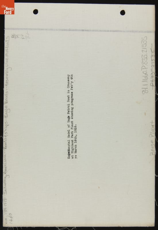 During World War I, Ford Motor Company built Eagle anti-submarine patrol boats for the U.S. Navy. Ford assembled the prototype boat at Highland Park and then moved it, on railroad flatcars, to the Rouge. The remaining Eagle hulls were constructed on site at the Rouge, but Ford continued to build the boats' turbine engines and propulsion systems at Highland Park.