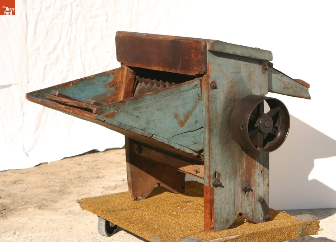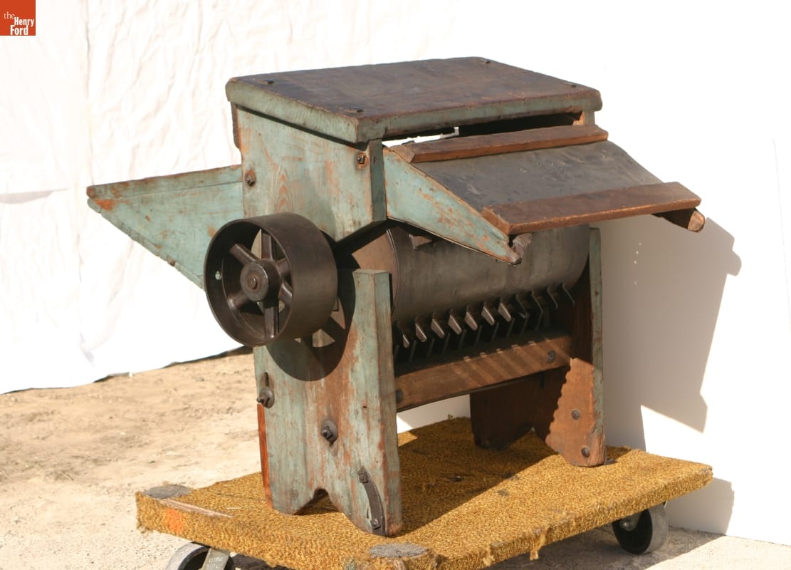Farm families raised most of their own food during the early 1800s. The more grain they raised for themselves and for market, the more they sought machines to reduce labor. This thresher beat the kernels from grain heads, thus replacing a laborer with a flail, but farmers needed a treadmill and oxen or horses to generate power to thresh grain. After threshing, farmers used a fanning mill to clean grain and bag it for market.