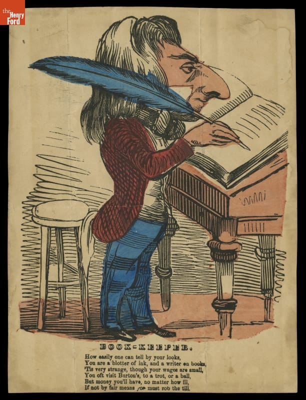 printed on front: BOOK-KEEPER. How easily one can tell by your looks, You are a blotter of ink, and a writer on books, 'Tis very strange, though your wages are small, You oft visit Burton's, to a trot, or a ball, But money you'll have, no matter how ill, If not by fair means you must rob the till.
