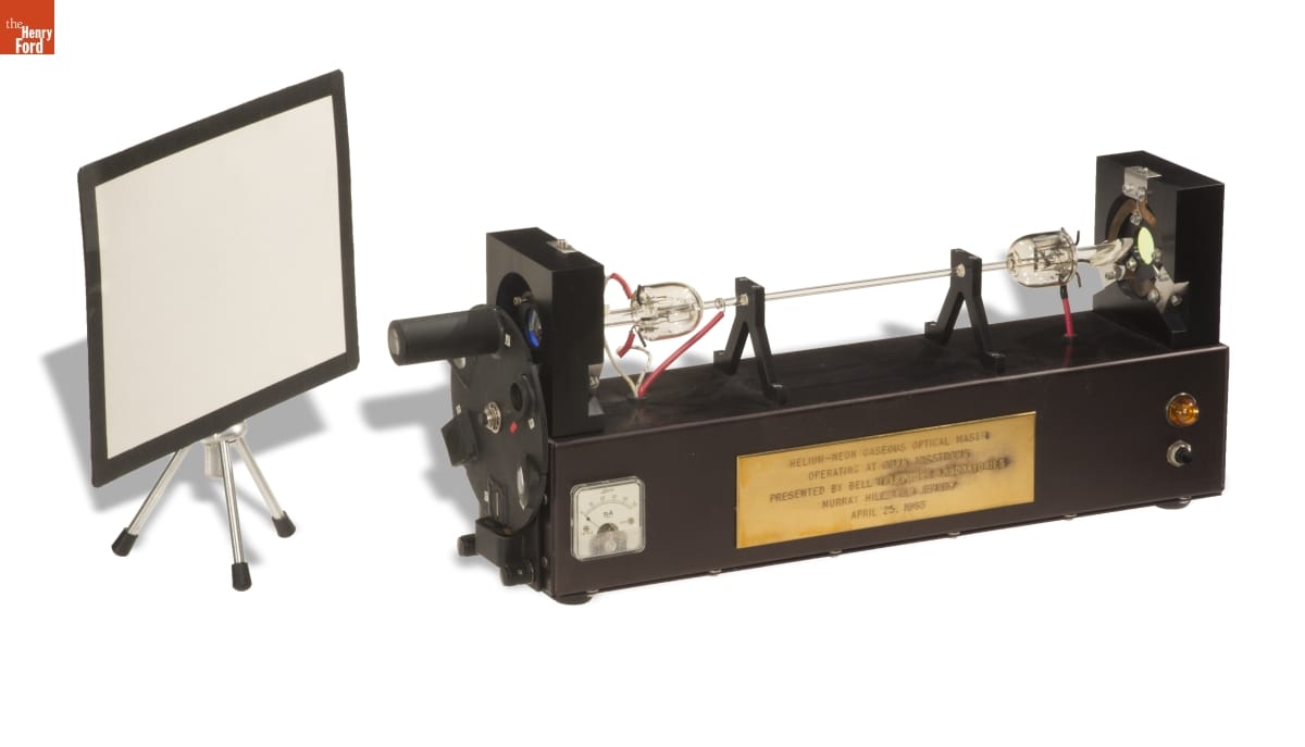 This is a demonstration device to promote the helium-neon gaseous optical maser. "Maser" was an early term used by Bell Laboratories, who were interested in the device's communication potential; "laser" predominated in the end. Presented to the museum at the Institute of Electrical and Electronics Engineers' meeting of 1963, this is one of the few maser demonstration versions ever made.