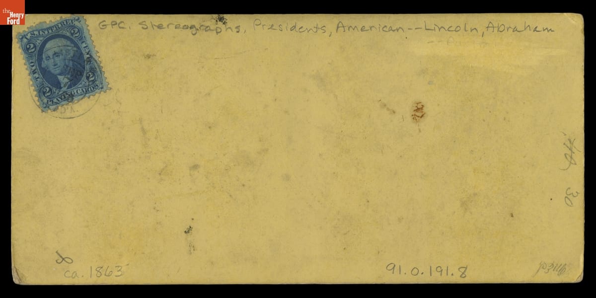 This stereograph shows President Abraham Lincoln seated in a chair beside a small table, holding a paper in one hand and folded spectacles in his other hand. Alexander Gardner originally made this photograph in Washington, D.C. on Sunday August 9, 1863. Gardner had just opened his new studio and President Lincoln agreed to be the first customer. The maker of this stereograph is unknown, but there is a two-cent tax stamp glued to the back, indicating it was made between 1864 and 1866.