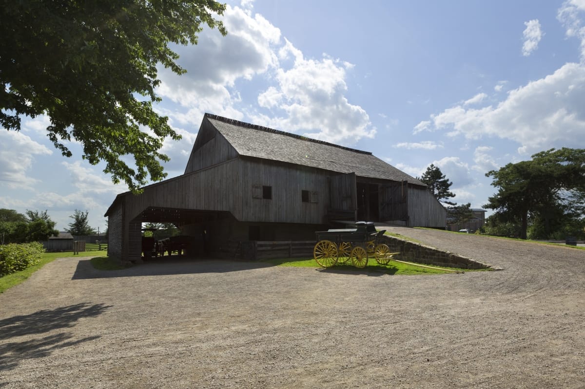 The Firestone barn is a Pennsylvania-German bank barn, an American barn type with Swiss origins. They are called bank barns because the barn is built into a bank, allowing wagons to be driven into the upper floor. Bank barns combined multiple farm functions under a single roof. Livestock were kept in the lower floor, crops on the upper floor.