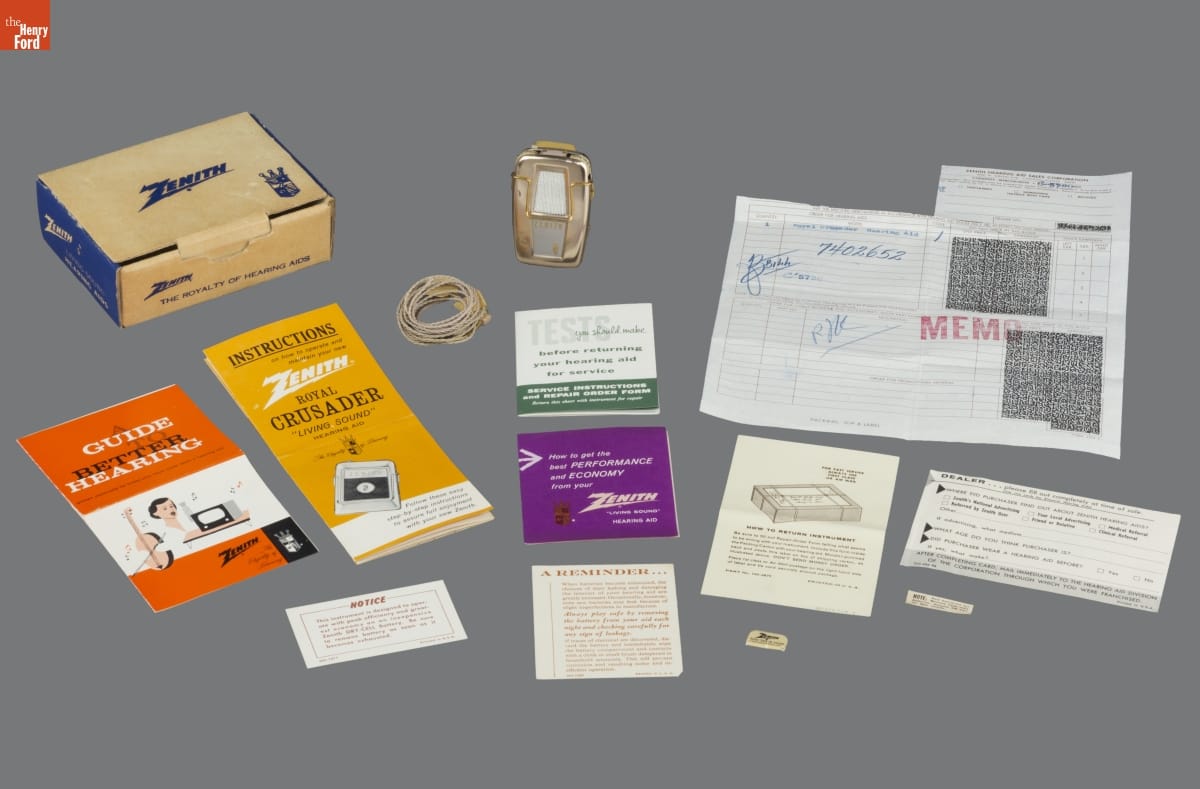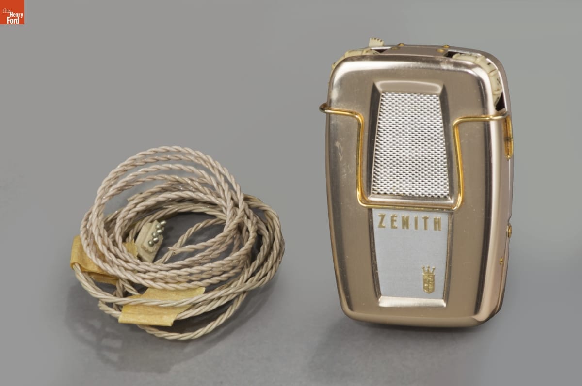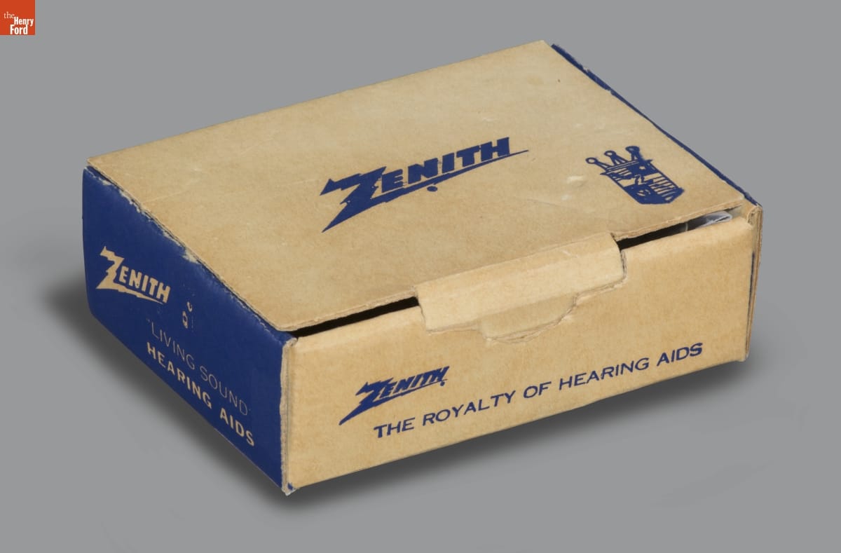 The invention of transistors went beyond miniaturization of radio technology. This small transistor-powered hearing aid gathered sound waves and transmitted the sound to the earpiece placed within the wearer's ear. The packaging is as interesting as the small hearing aid device; it was carefully designed by the donor, Mel Boldt, to appeal to the style-conscious consumers in the 1960s.