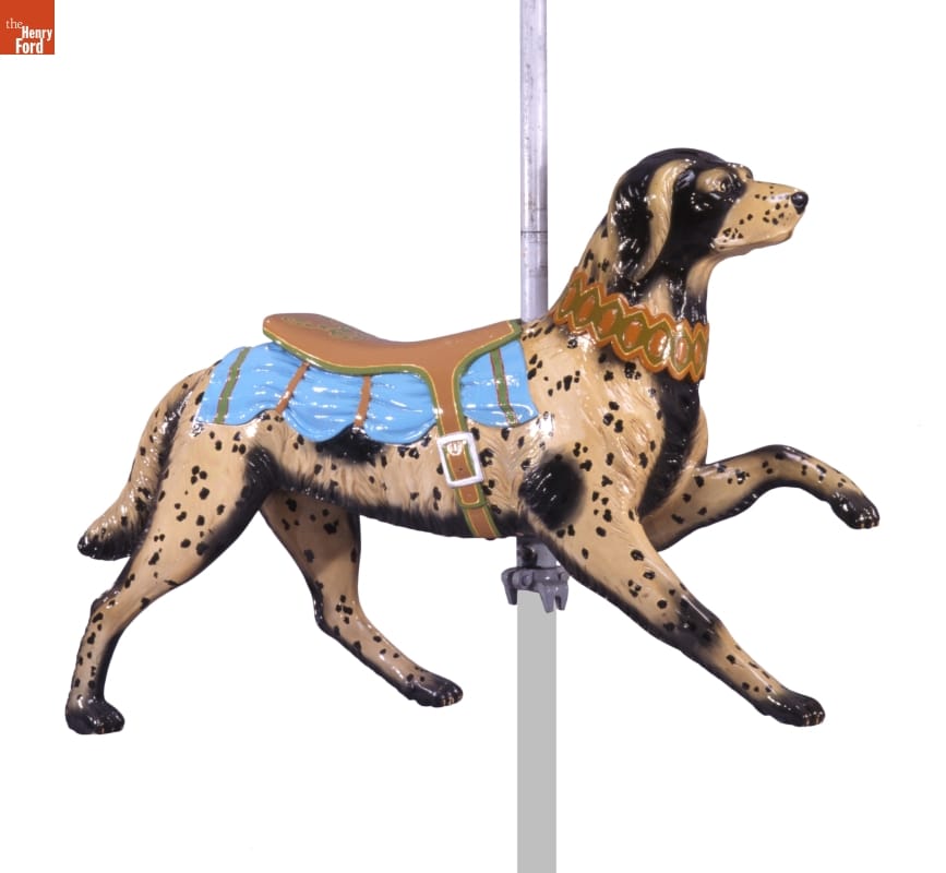 This hand-carved figure was made by Herschell-Spillman, the largest U.S. carousel manufacturer between 1904 and 1920. Called a "jumper," the figure moved up and down as the carousel revolved. Carousels were extremely popular in amusement parks and seaside resorts at this time. They often included animals other than horses. This figure is on an operating carousel in Greenfield Village.