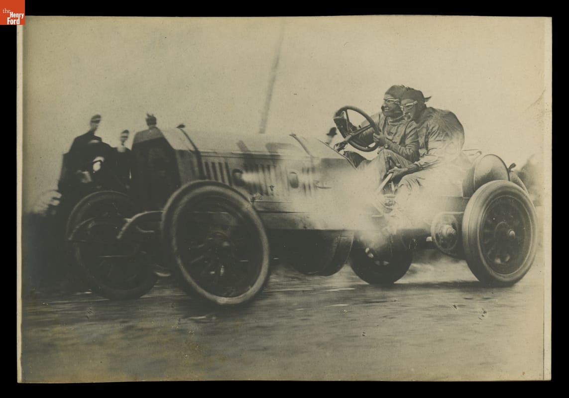 This racing car set the fastest 1906 Vanderbilt Cup lap, but finished in tenth place. In 1908, shod with improved tires, the Locomobile thundered to victory. "Old 16," as it was known afterward, was the first American car to win a major international road race. In this photograph, the driver and mechanic wear protective cloth face masks, goggles, and leather helmets.