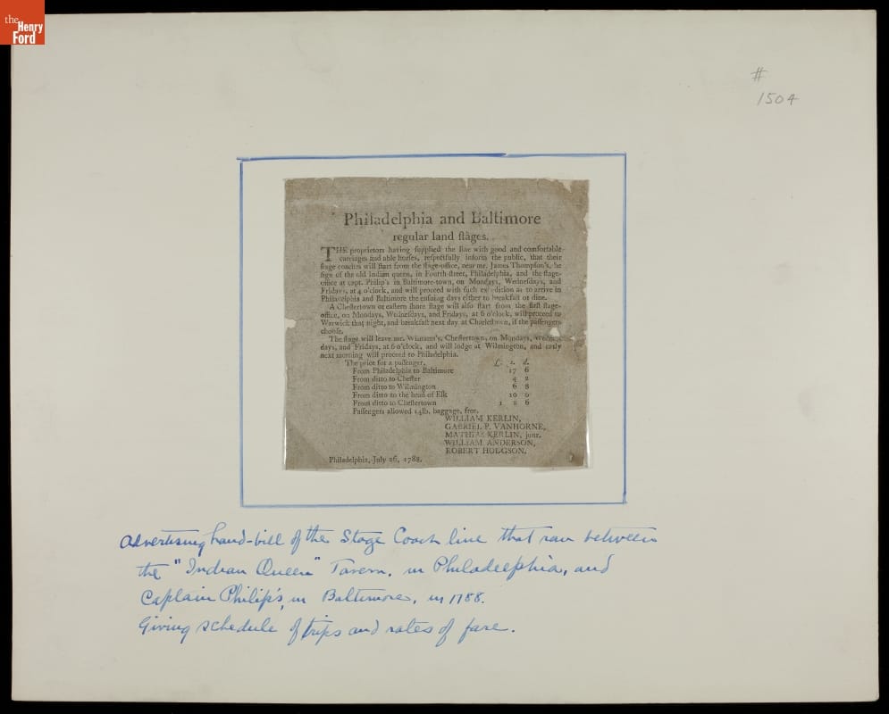 This small advertising broadside from 1788 gives the schedule of trips and rates of fare for a stage-coach line that ran between the "Indian Queen" Tavern in Philadelphia, Pennsylvania, and Captain Philip's in Baltimore, Maryland.