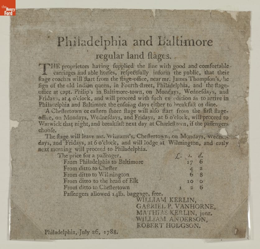 Broadside, "Philadelphia and Baltimore Regular Land Stages," 1788