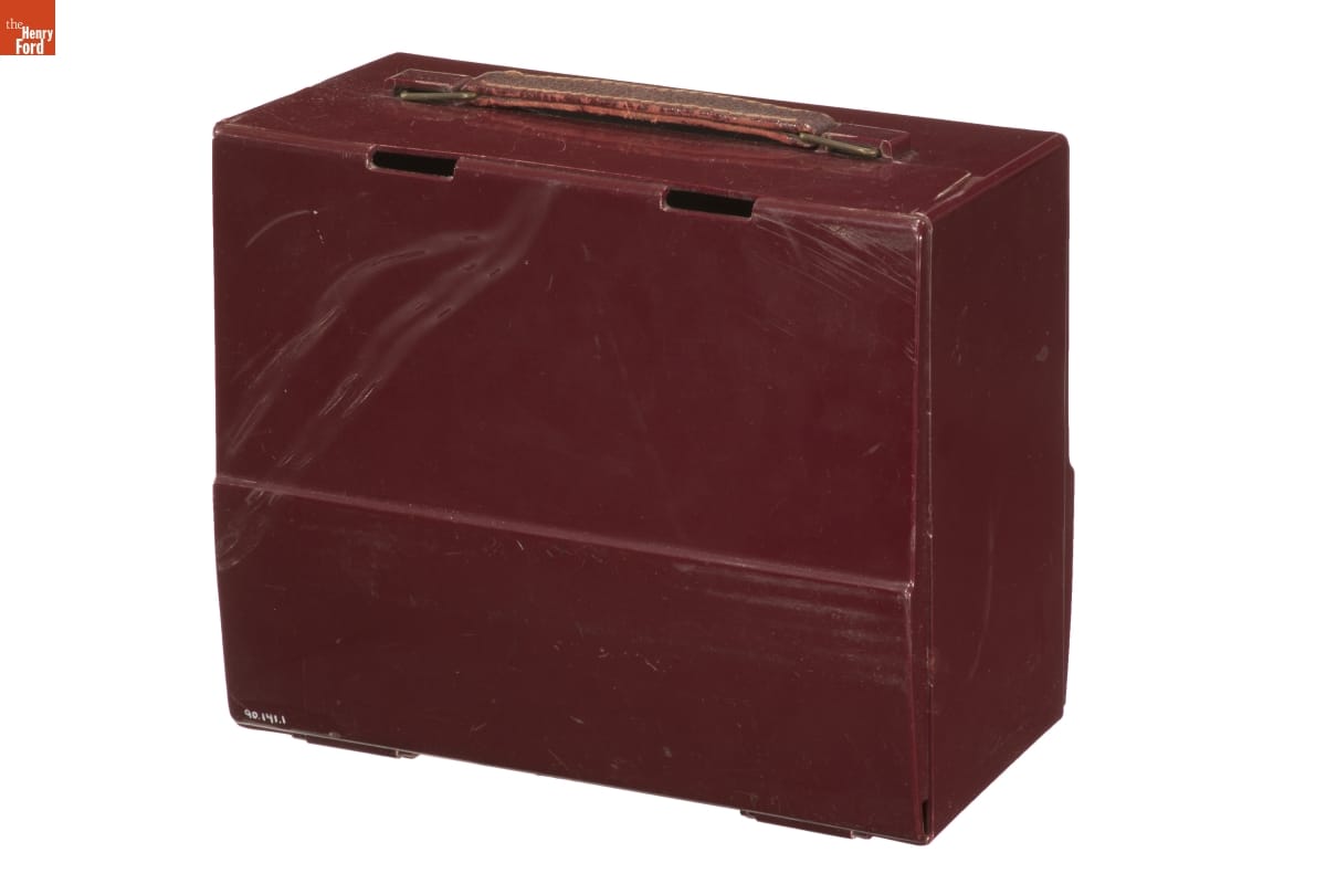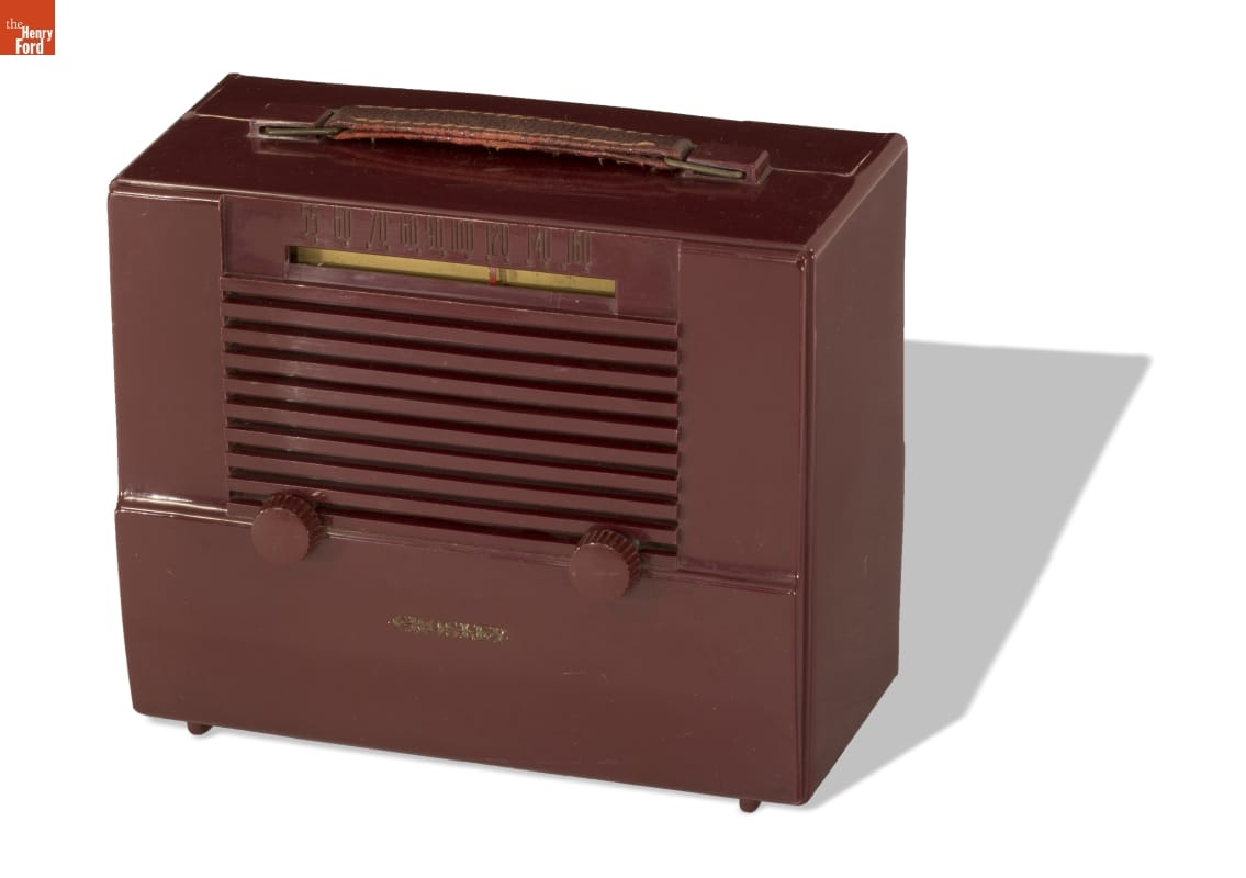Radios for the home were often showpieces--examples of the most current and fashionable design--but the focus of this radio is portability and durability. Battery operated, it is made of durable plastic, and a handle assists in carrying the set. The overall design is reminiscent of a lunchbox. In addition to radios, Crosley manufactured automobiles and household appliances.