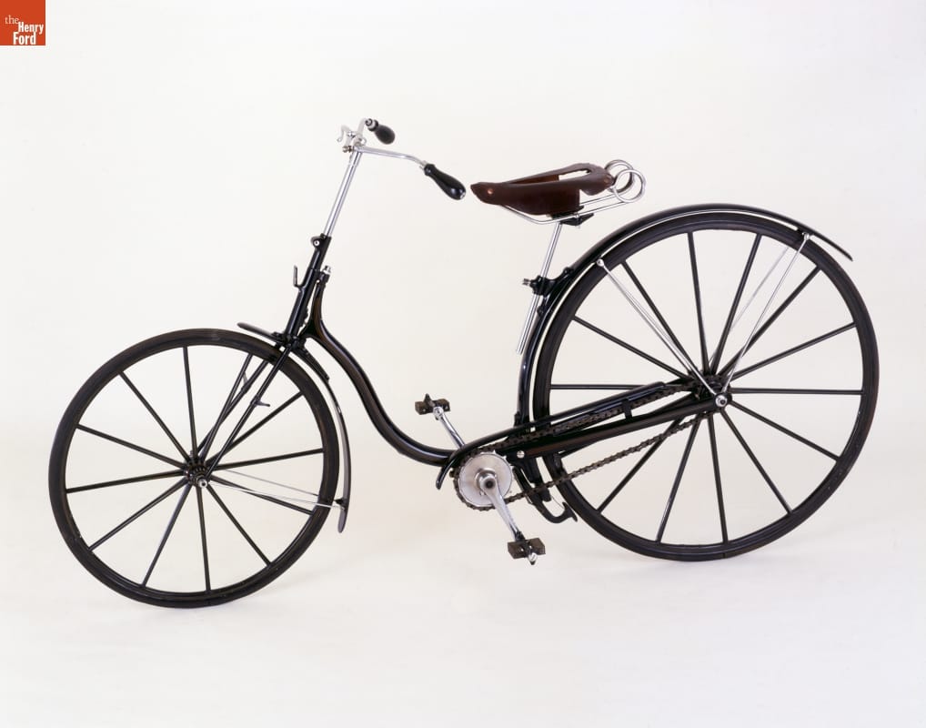 Many women in the late 19th century wanted to ride bicycles. But mounting a high-wheel ordinary was difficult, especially in a period dress -- and donning athletic attire or bloomers for some was considered socially unacceptable. The safety bicycle changed that. This drop-frame safety allowed women to mount the bicycle easily and accommodated the dresses worn by riders.