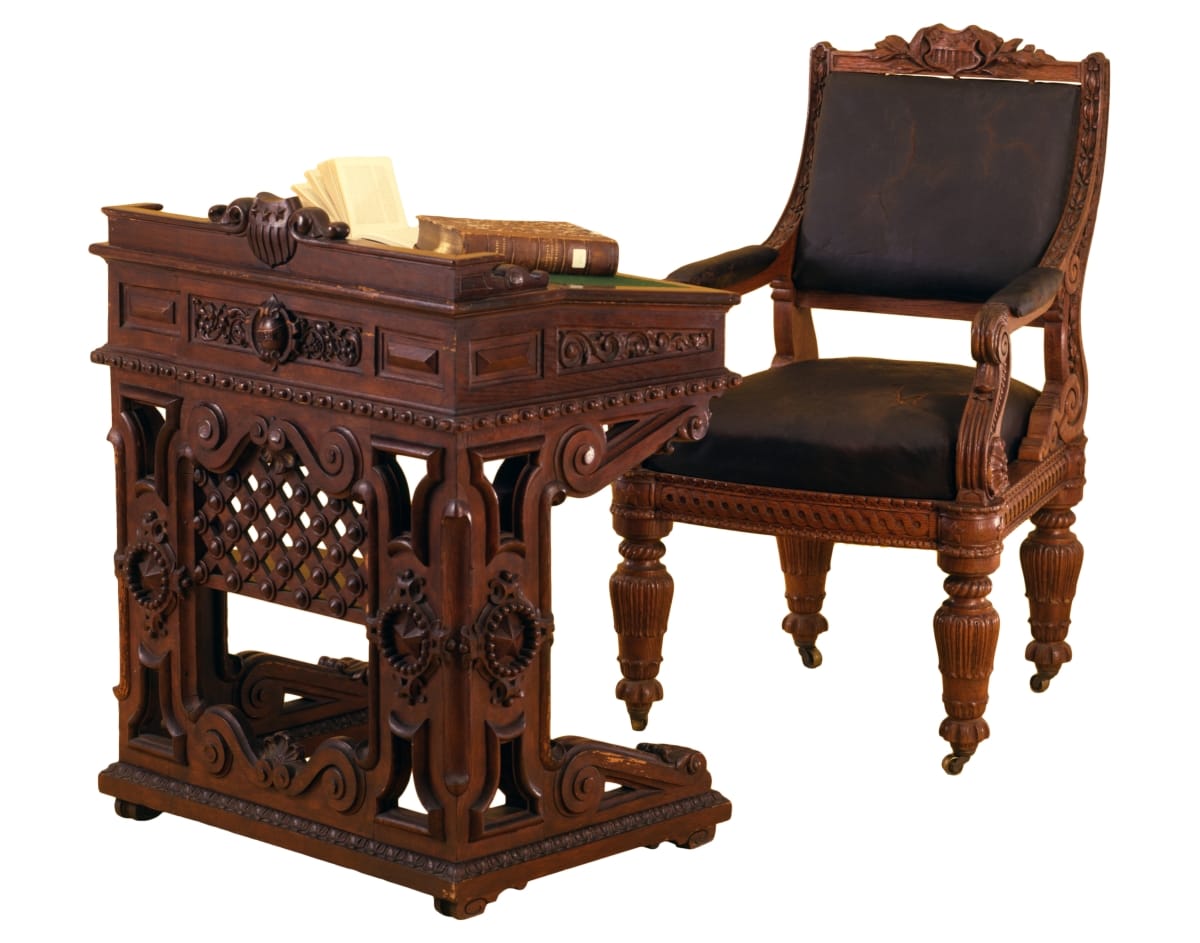 This desk and its companion chair (68.127.1) were designed by architect Thomas U. Walter for the United States House of Representatives Chamber in 1857, as part of an expansion of the Capitol. The pieces look impressive--but members of the House complained that they were too cumbersome. Within two years, many of the chairs were sold; by 1873 all of the pieces were removed.