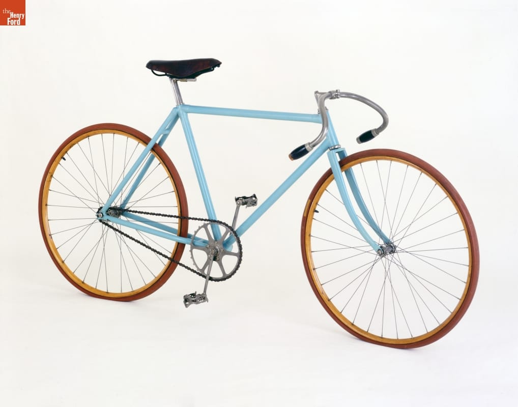 The sleek, light Tribune "Blue Streak," built by Black Manufacturing Company of Erie, Pennsylvania, was a racing favorite. Charles "Mile-a-Minute" Murphy used a Tribune "Blue Streak" to set the mile speed record in 1899. This 1898 model was used by another cyclist who later became America's first automobile racing hero: Barney Oldfield.