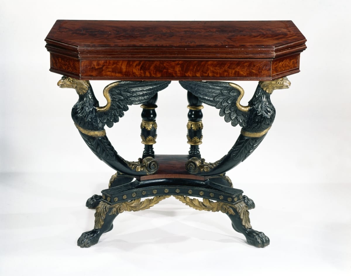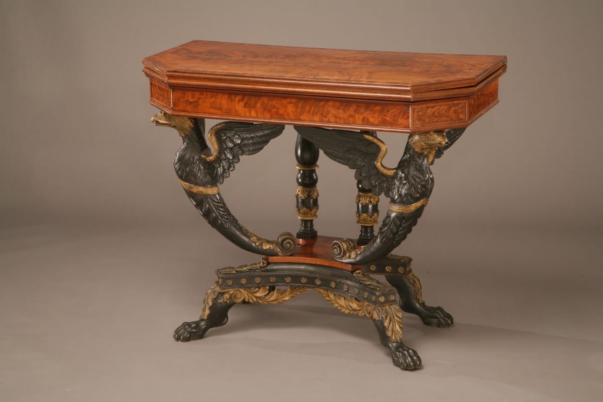Flip-top game tables were highly desirable objects in early 19th century America. This one is as fancy as they got, complete with carved, winged griffins, and hairy paw legs.