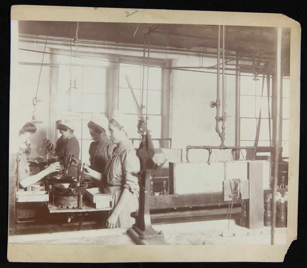 Before complete mechanization of the manufacturing process, many tasks at the Heinz factory were done by hand. The H. J. Heinz Company documented the many departments of the manufacturing process through photographs. This photograph shows employees working in the Ketchup Department.