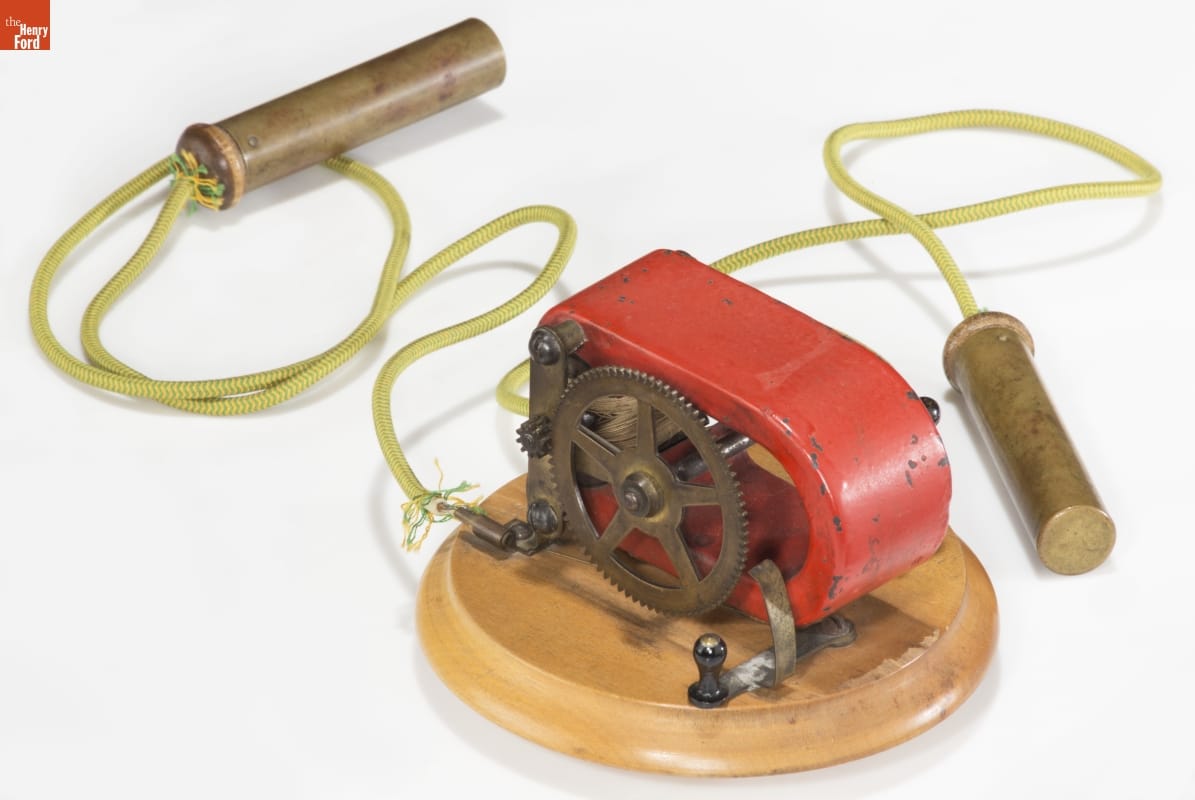 Milton Wright owned this electric shock machine. One person turned the small hand-cranked electric generator, while another person -- perhaps unsuspectingly -- took hold of the metal handles. The current passed through the second person's body and caused a mild, though definitely noticeable, electric shock. Some people thought these machines offered health benefits. Others simply enjoyed their novelty.
