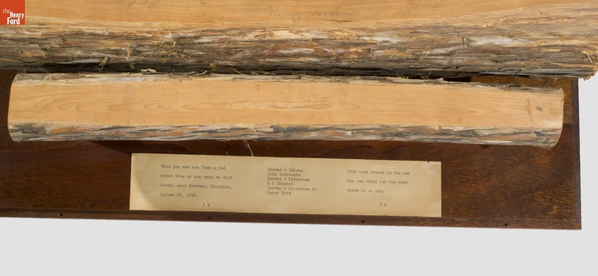 The larger of the 2 logs is signed by Thomas Edison, John Burroughs, Harvey S. Firestone, R.G.H. DeLoach, Harvey S. Firestone, Jr., and Henry Ford. The quotation on the larger log: "YOUR BEST FRIEND IS THE ONE WHO CAN BRING OUT THE BEST THERE IS IN YOU" is signed by John Burroughs. On the smaller log is pencilled "Robert E. Lee".