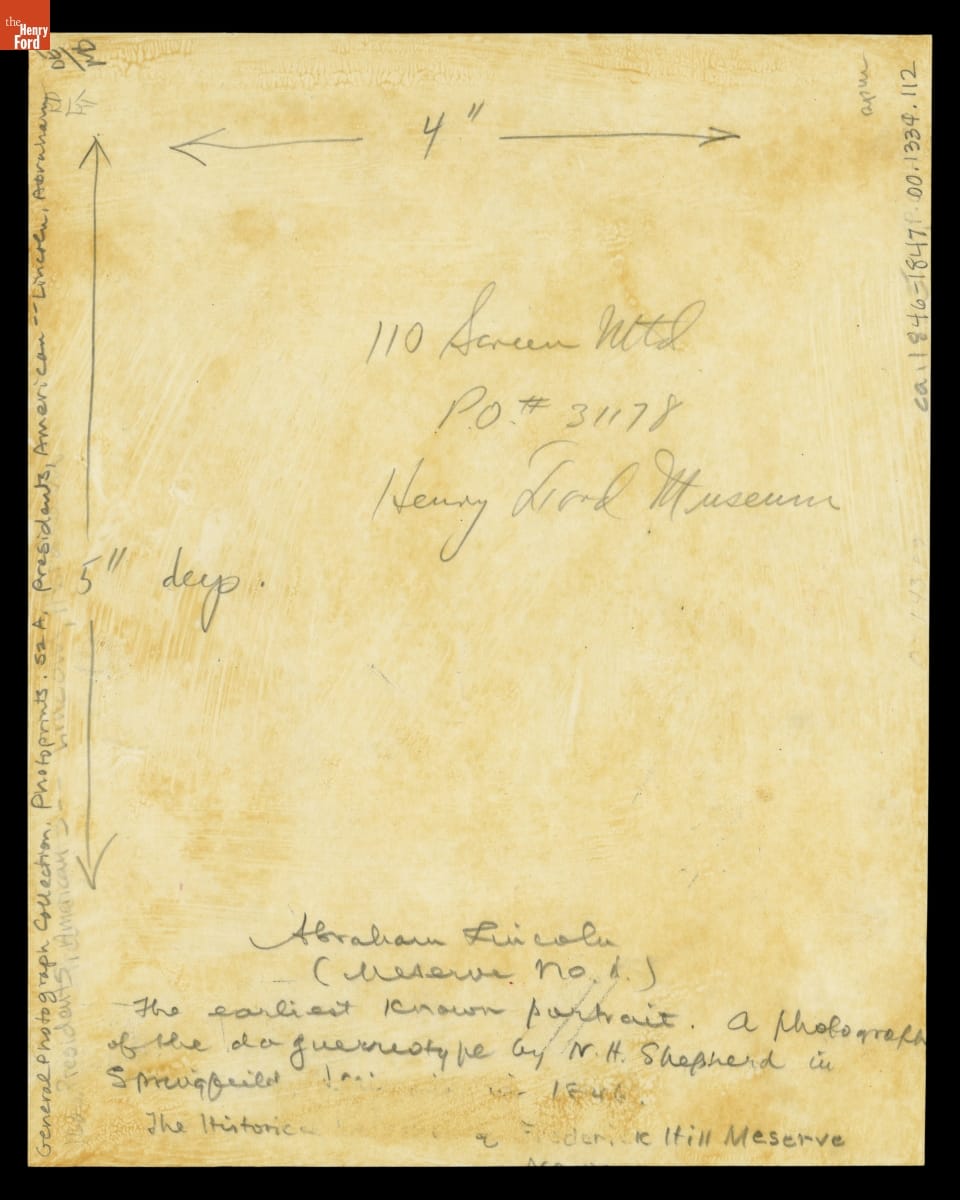 Handwritten on back in pencil: Abraham Lincoln / (Meserve No. 1.) The earliest known portrait. A photograph / of the daguerreotype by N.H. Shepherd / in Springfield [obscured text] in 1846 / The Historic [obscured text] Frederick Hill Meserve
