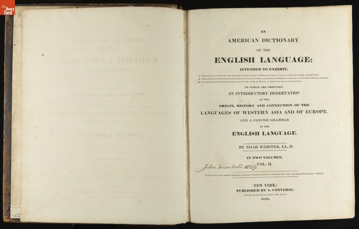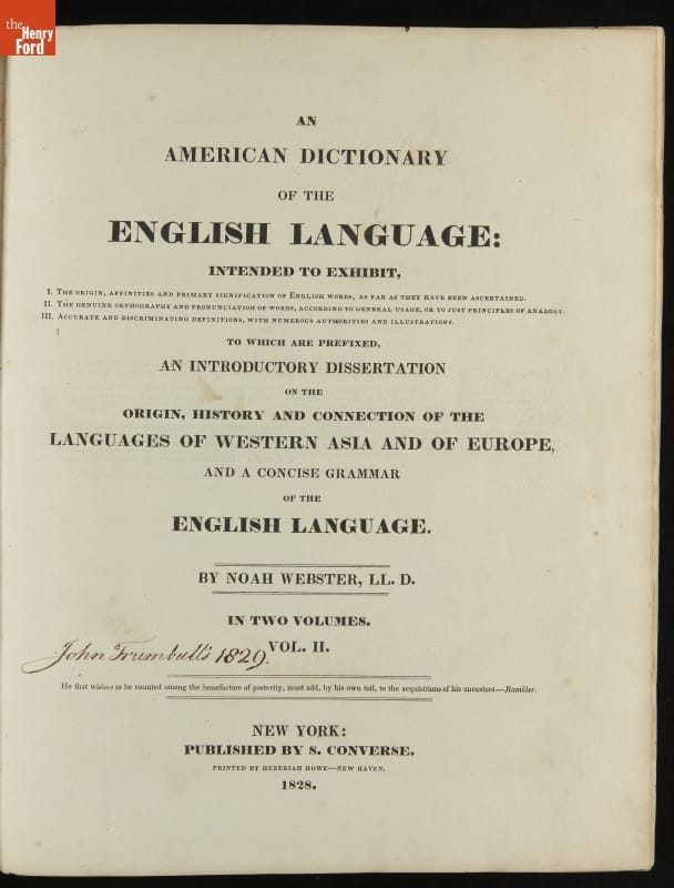 Dictionary by Noah Webster; printed by Hezekiah Howe, New Haven, Connecticut; published by S. Converse, New York, New York. Frontispiece engraved by A. B. Durand after a portrait by Samuel Morse; printed by J. R. Burton.