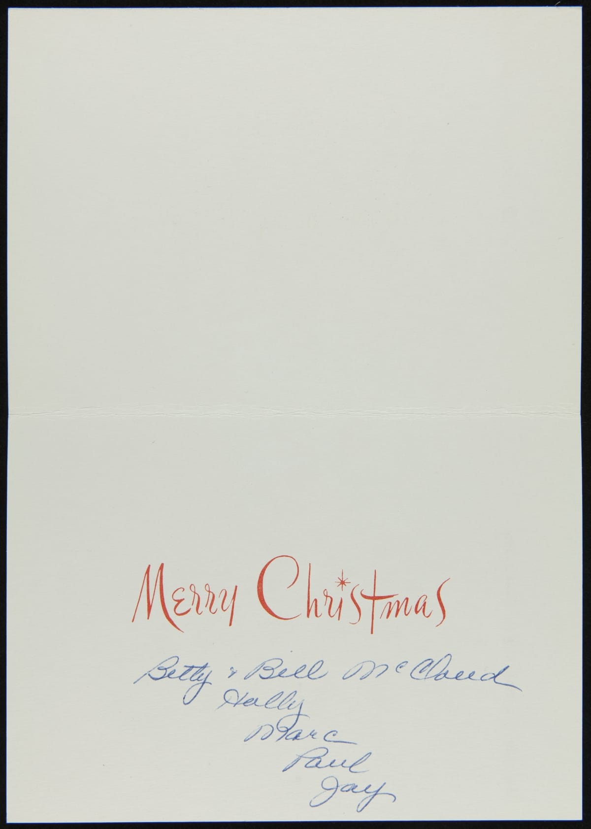 Mailing colorful, commercially designed greeting cards was a 20th-century American tradition. During the holidays, friends and neighbors commonly exchanged cards wishing the recipient a merry Christmas. Santa Claus, a regular feature, is sometimes depicted non-traditionally in scenes that reflect the time. The carousel in this circa 1955 example -- a common attraction at postwar-era kiddie parks -- represents the youthful delight of the season.