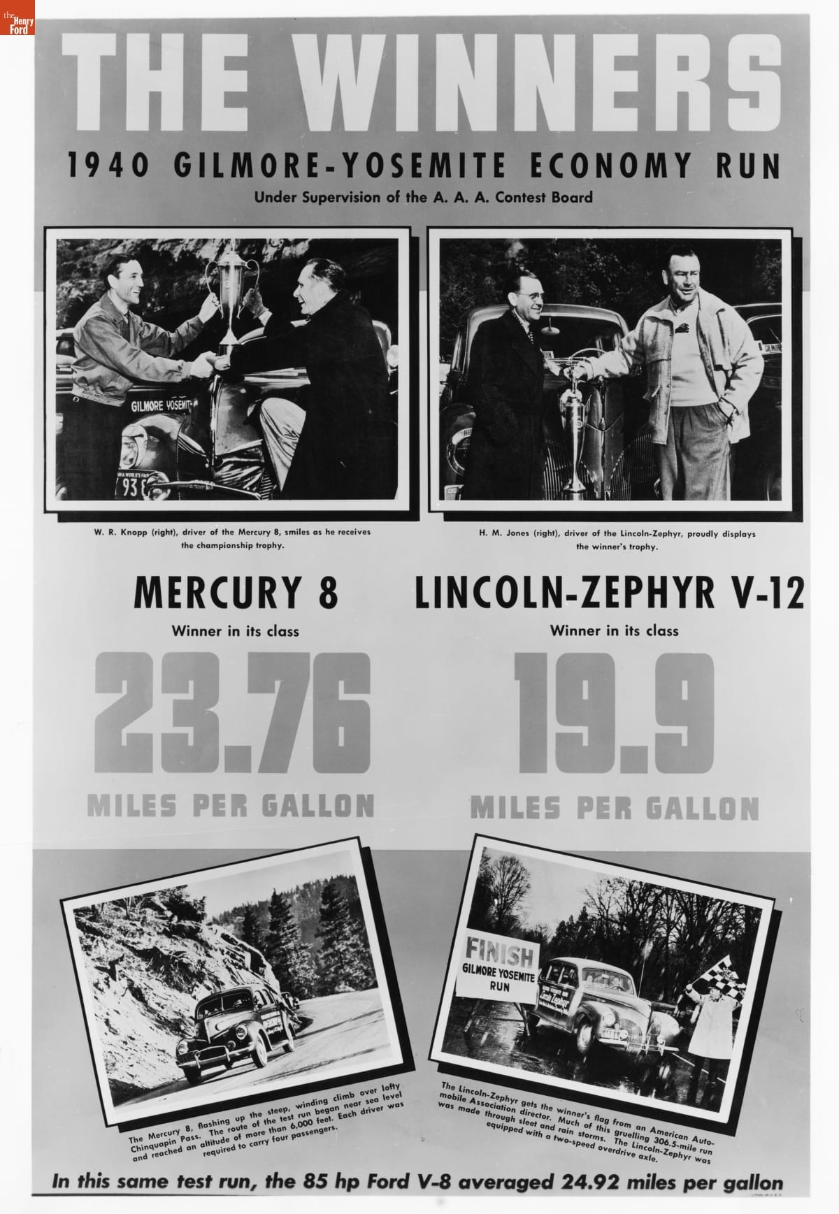 In January 1940, Ford Motor Company cars were driven 306 miles from Los Angeles to Yosemite National Park. Gilmore Oil Company sponsored the economy run, which demonstrated high fuel economy among participating vehicles. A Mercury V-8 achieved 23.76 miles per gallon, while a Lincoln Zephyr V-12 scored 19.9 miles per gallon. Each car won its respective class.