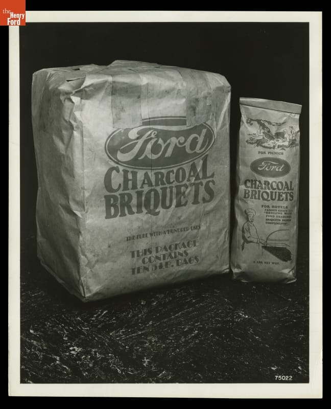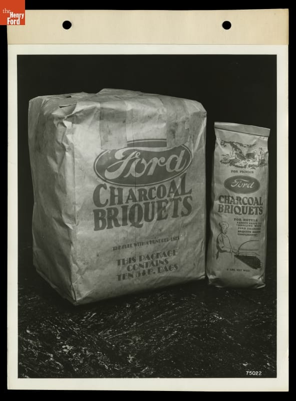 Ford Motor Company sawmills created heaps of wood wastes. Some was used to produce steam for factory operations. The rest was carbonized and compressed into charcoal. Workers mixed charred hardwood chips with starch, forming nearly 100 tons of charcoal briquettes each day. Dealers sold branded bags of the popular briquettes in Ford dealerships across the country.