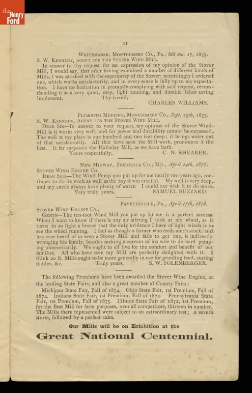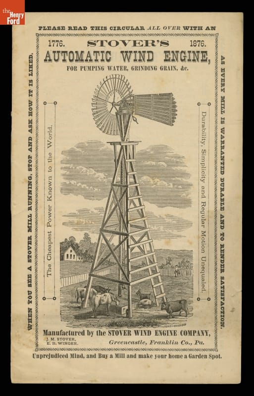 on front: 1776 STOVER'S 1876. / AUTOMATIC WIND WNGINE, FOR PUMPING WATER, GRINDING GRAIN, &c. / PLEASE READ THIS CIRCULAR ALL OVER WITH AN Unprejudiced Mind, and Buy a Mill and make your home a Garden Spot. . . . on page 11: . . .Our Mills will be on Exhibition at the Great National Centennial