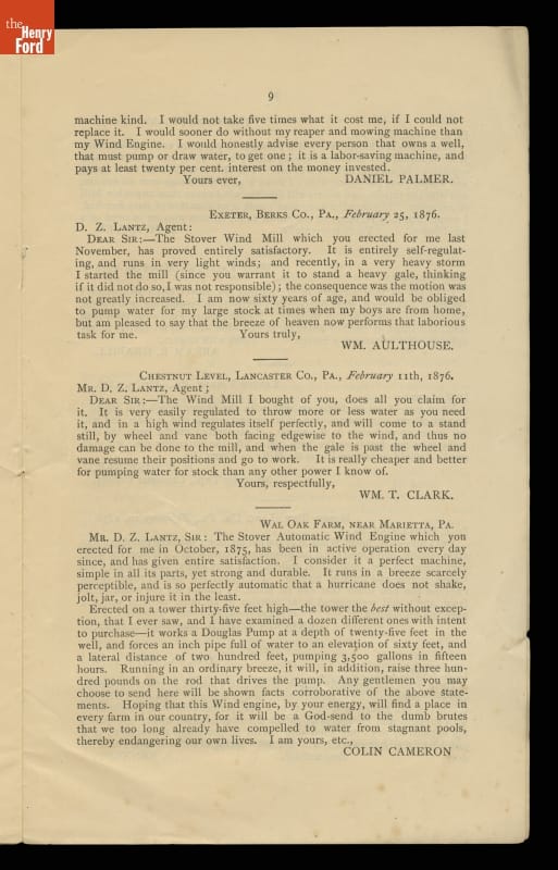 Many American farmers in the late 1800s bought windmills to pump water and power machinery. The Stover Wind Engine Company -- one of several companies that used the Stover name -- manufactured windmills for a brief period around the late 1870s. With pages of testimonials, this Stover catalog touted the durable construction and labor- and money-saving qualities of its windmills.