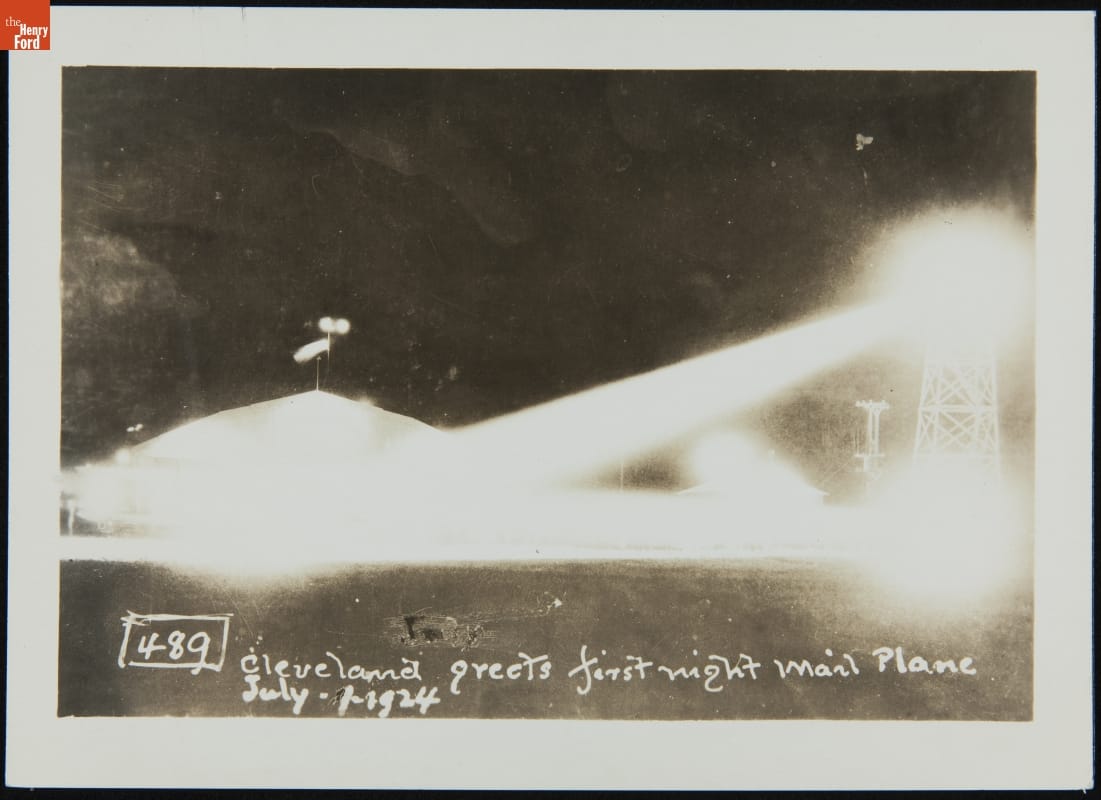 Early pilots depended on visual landmarks, preventing reliable nighttime navigation. When the postal service took to the skies with transcontinental mail delivery, a lighted pathway was formed to guide pilots at night. Throughout the 1920s, a series of powerful light beacons was built, eventually stretching from New York to San Francisco. This image celebrates Cleveland's first night mail flight.