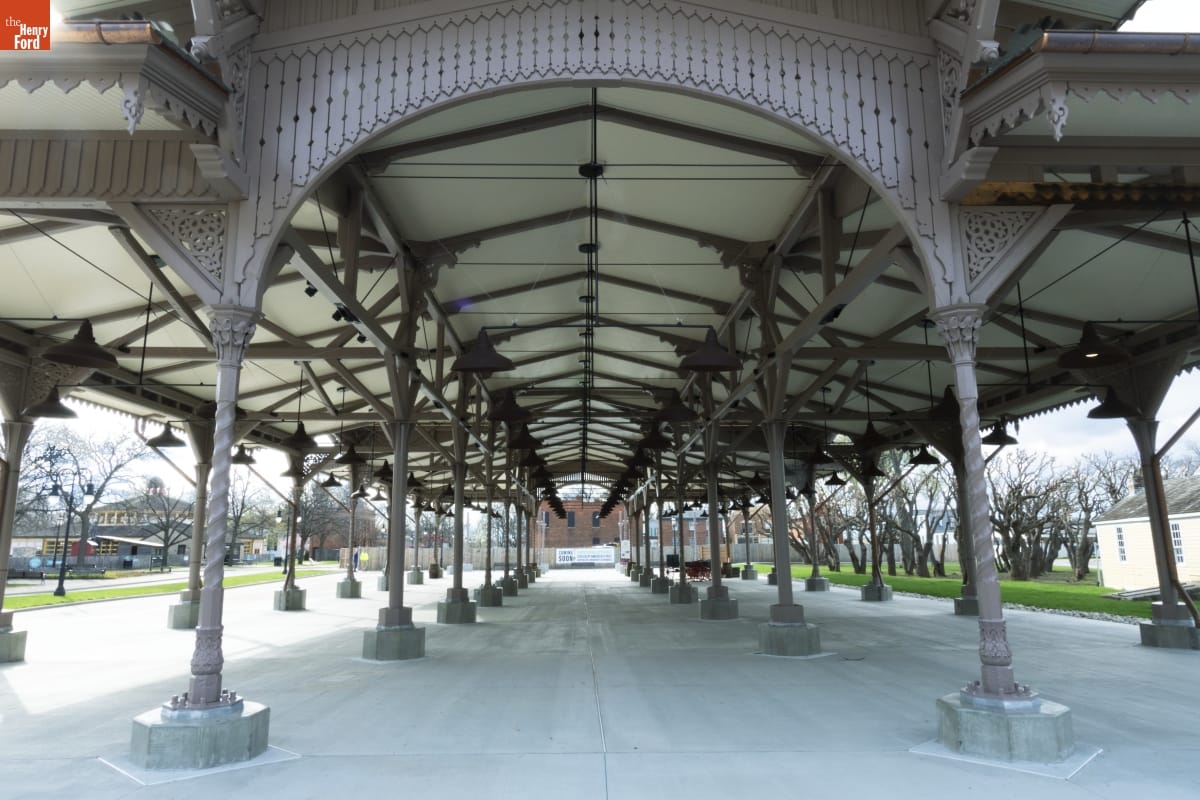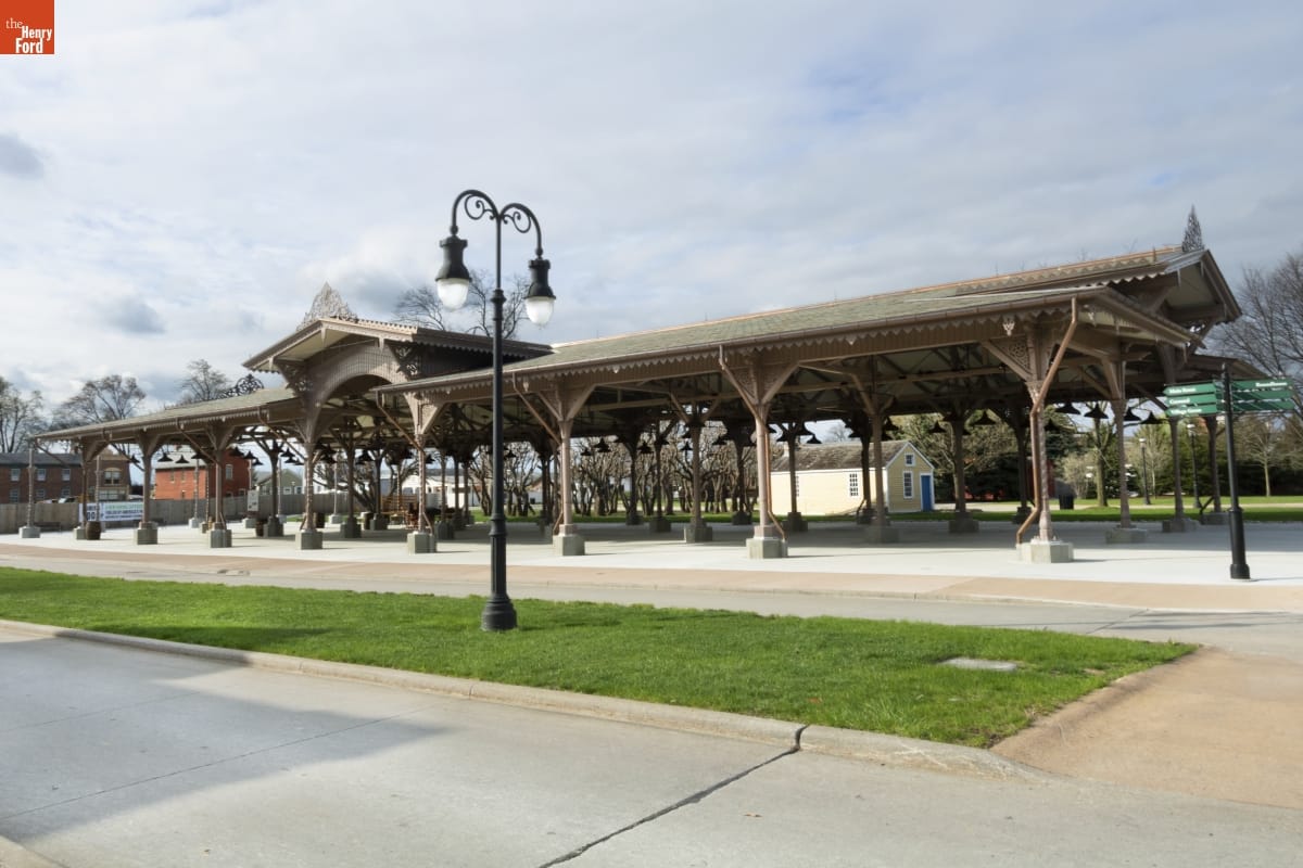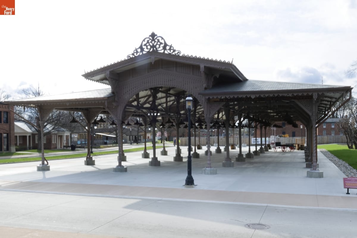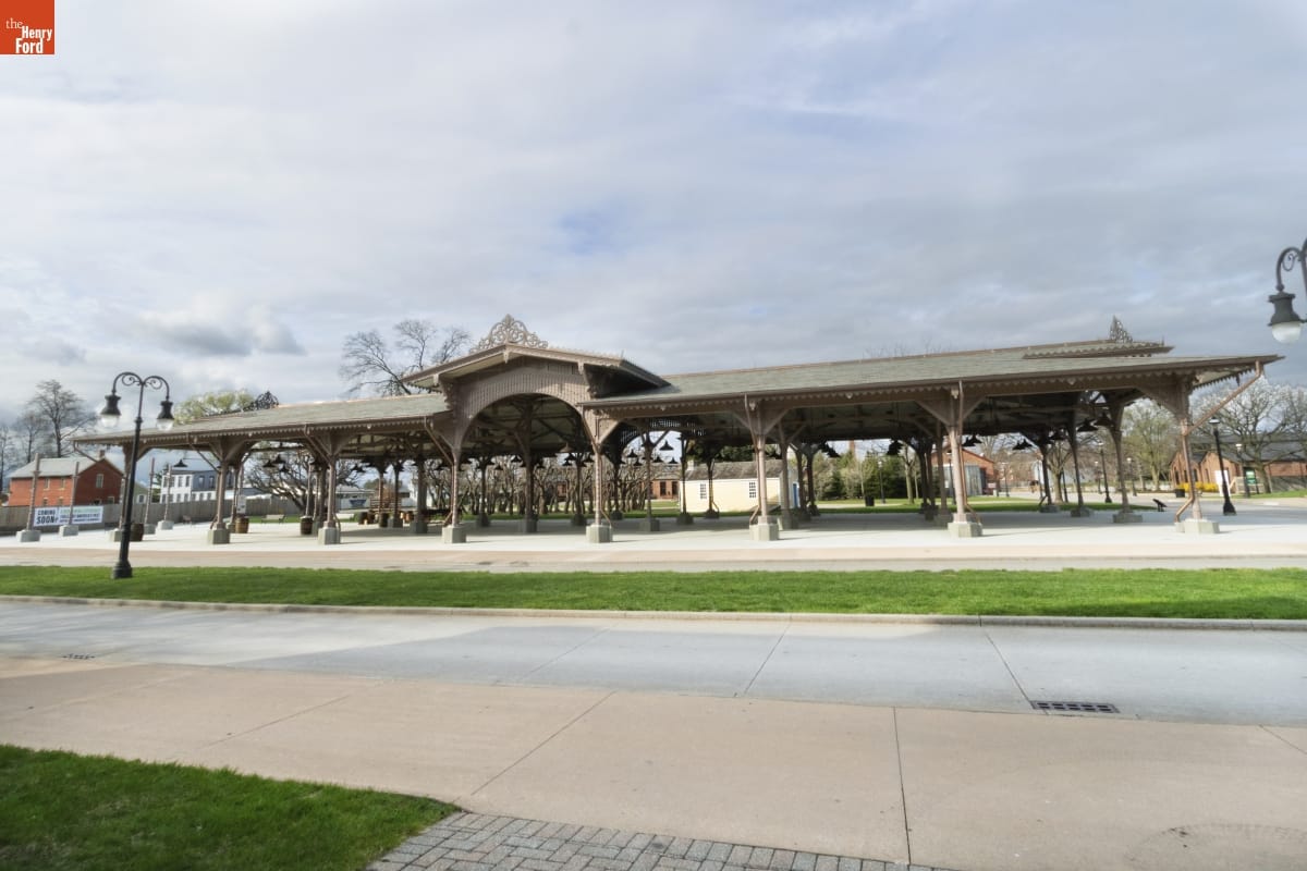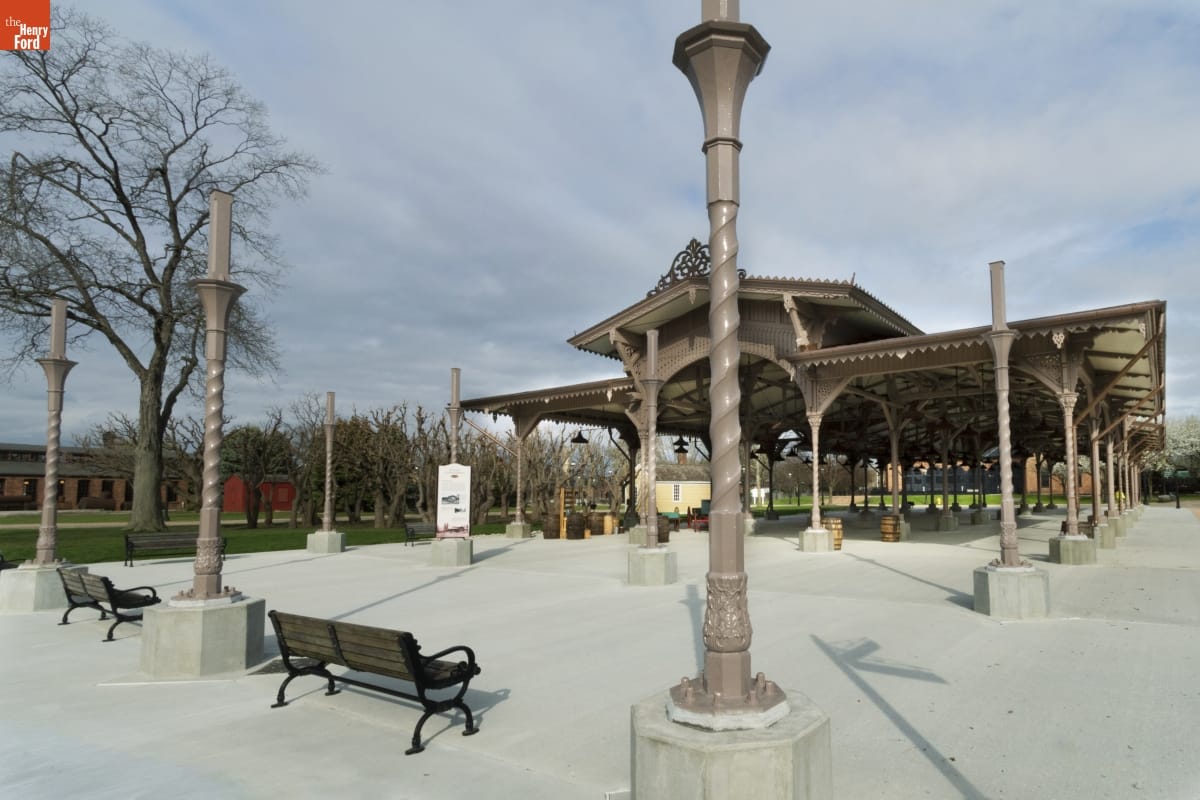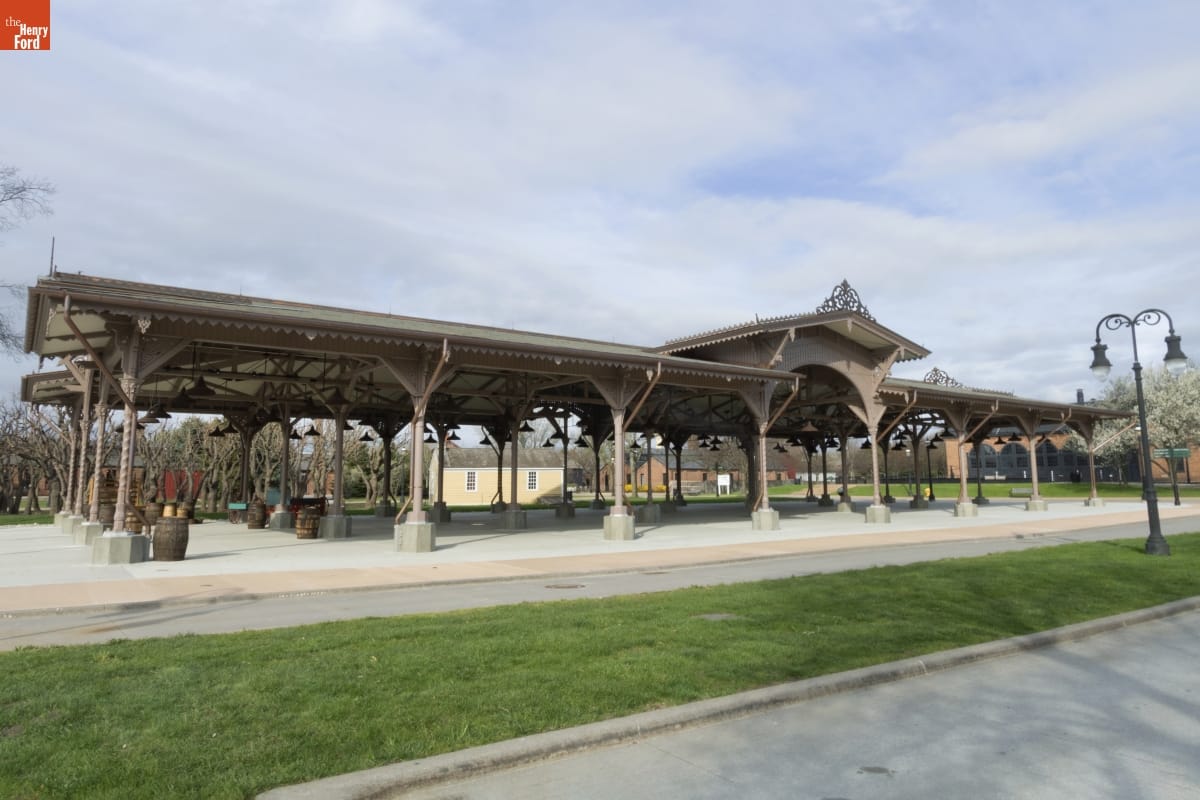 The Detroit Central Market's vegetable shed sheltered vendors and customers from 1861 to 1894. The structure was then removed to Belle Isle and was slated for demolition in 2003 when The Henry Ford acquired it. The reconstructed building--which opened in Greenfield Village in 2022--includes several original cast-iron columns and ornamental woodwork, siding, and other details that convey the Swiss-Chalet aesthetic of the original design.