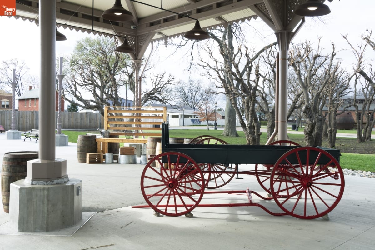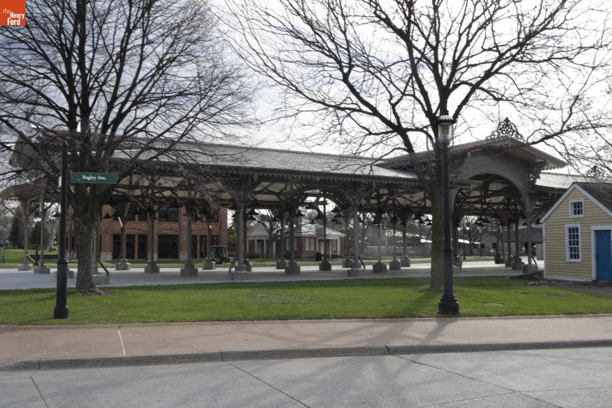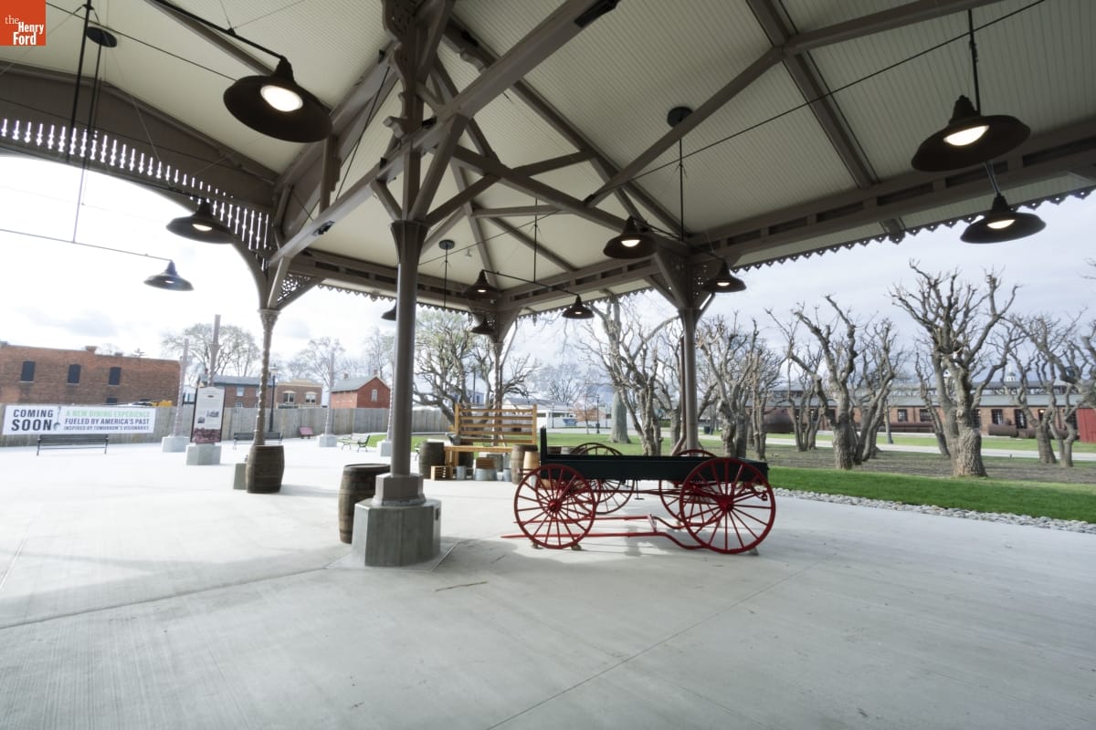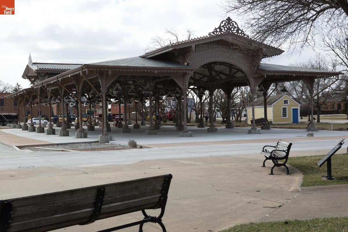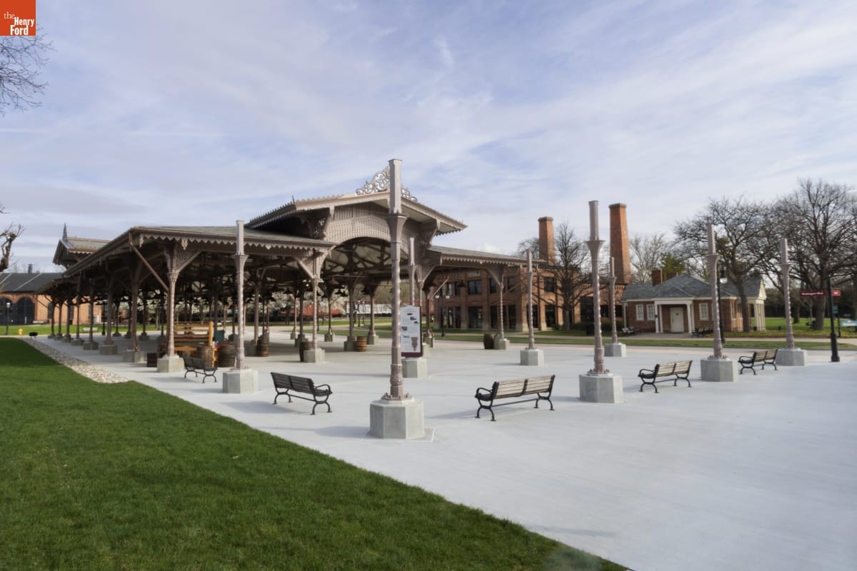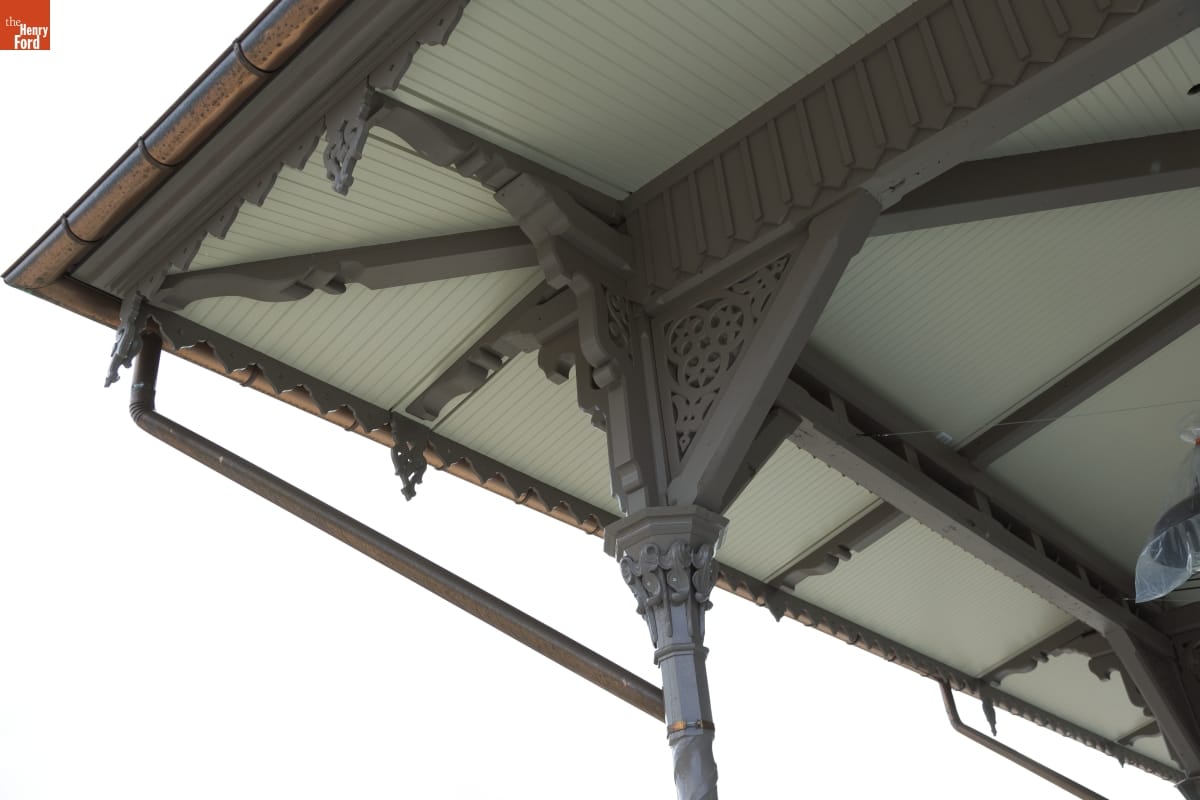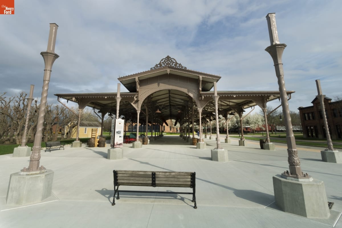 The Detroit Central Market's vegetable shed sheltered vendors and customers from 1861 to 1894. The structure was then removed to Belle Isle and was slated for demolition in 2003 when The Henry Ford acquired it. The reconstructed building--which opened in Greenfield Village in 2022--includes several original cast-iron columns and ornamental woodwork, siding, and other details that convey the Swiss-Chalet aesthetic of the original design.