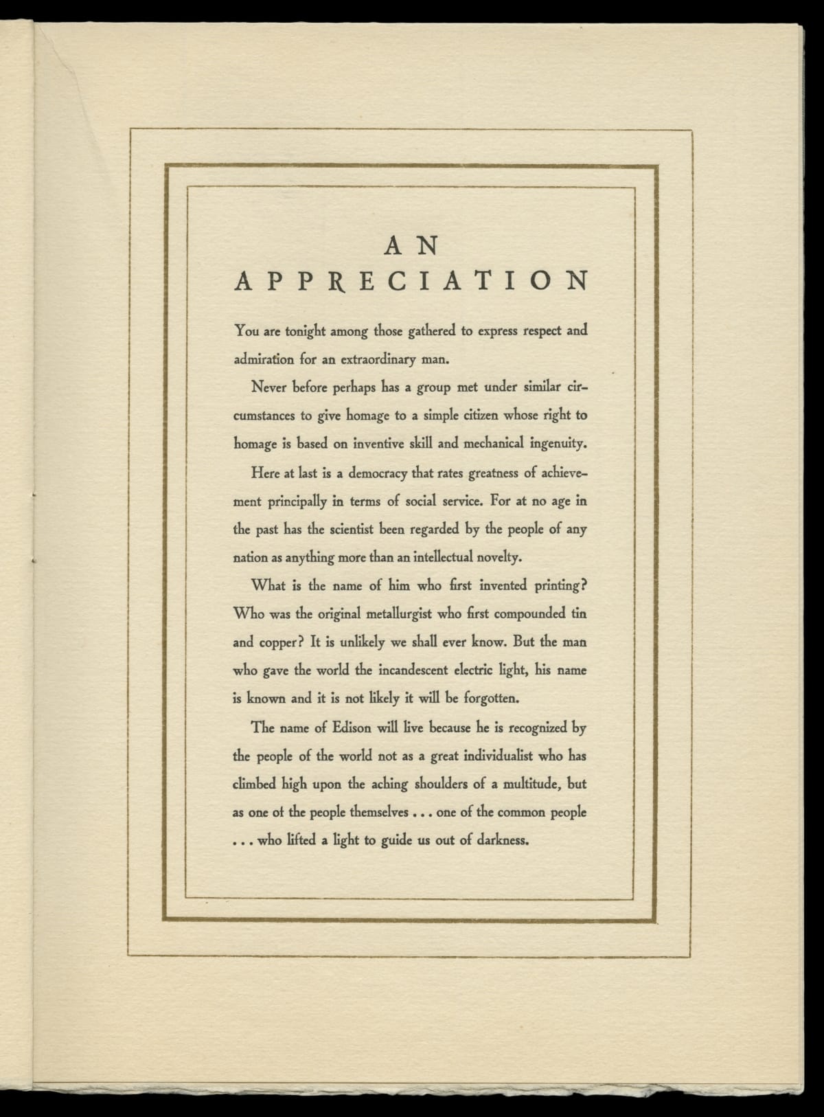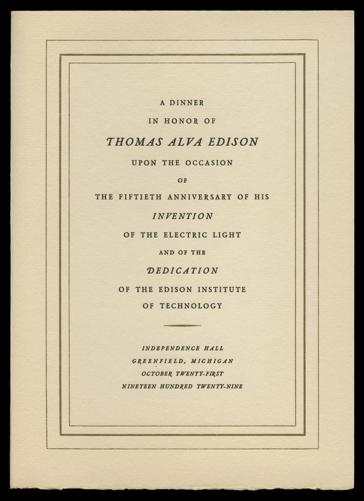on front: UPON THE OCCASION / OF / THE FIFTIETH ANNIVERSARY OF HIS/ INVENTION / OF THE ELECTRIC LIGHT / AND OF THE / DEDICATION / OF THE EDISON INSTITUTE / OF TECHNOLOGY / INDEPENDENCE HALL / GREENFIELD, MICHIGAN / OCTOBER TWENTY-FIRST / NINETEEN HUNDRED TWENTY-NINE