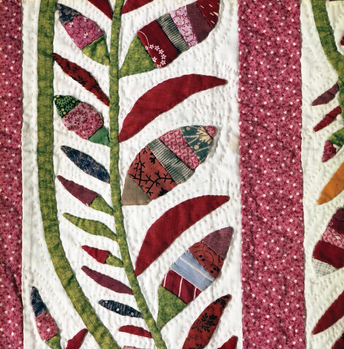 Note(s): "Vine" pattern is made of rhythmically undulating vines of a green printed cotton with leaves pieced of many different fabrics; the pattern is a one of a kind, unique design