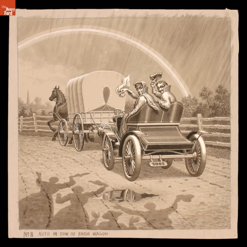 Before movies, Americans delighted in "Magic Lantern" slide shows. Artist Joseph Boggs Beale drew eight images for the 1906 slide series "Mr. Spurt and His Auto," lampooning the problems of early motoring. In this eighth slide, the Spurts and their broken-down car are towed back home by the obliging farmer. The rainbow overhead reflects the happy ending to their drive.