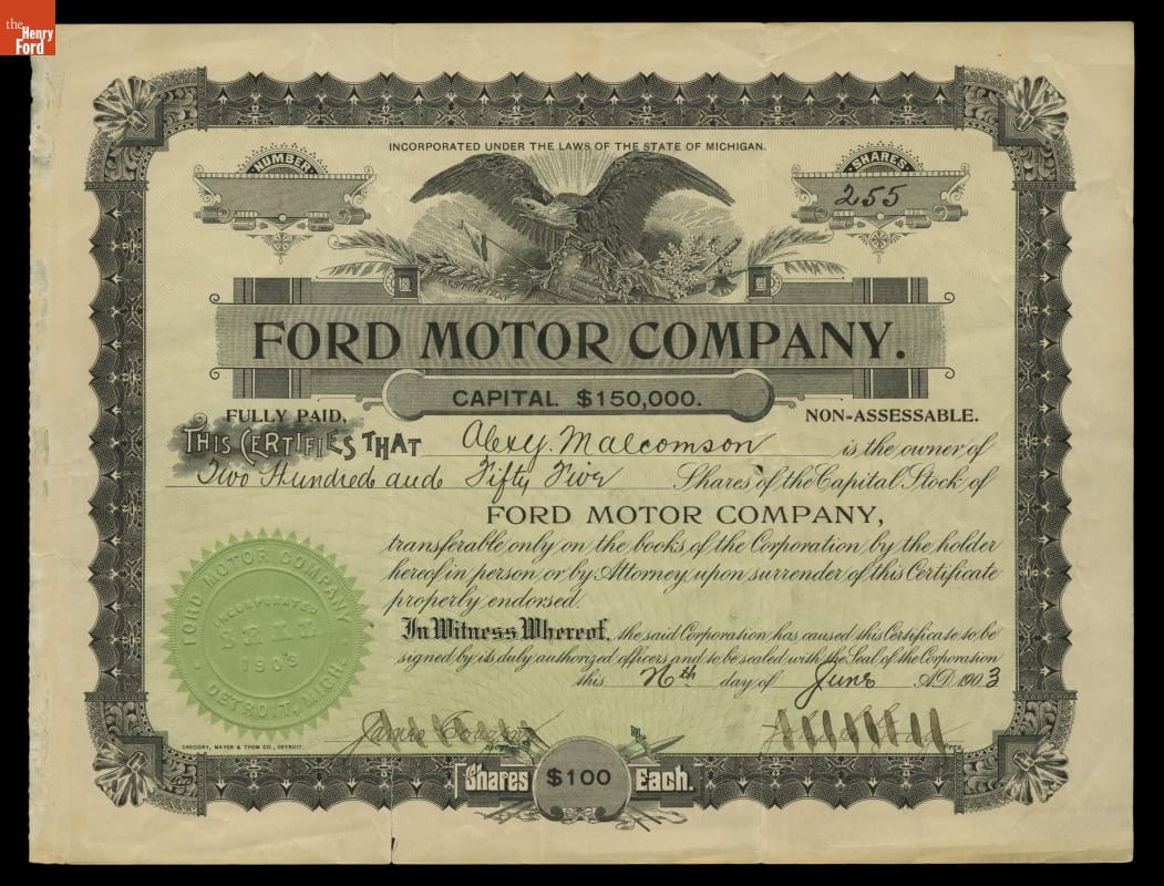 This is one of the first shares of Ford stock. It was issued to Alexander Malcomson, a wealthy Detroit coal merchant. He took a liking to young Henry and agreed to back his third attempt at starting a company despite the fact that Ford had failed twice before. Malcomson was instrumental in finding wealthy backers for the new company.