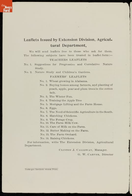 Among George Washington Carver's contributions were the bulletins he issued from the Agricultural Experiment Station at the Tuskegee Institute. This pamphlet, written for teachers, treats the popular topic of "nature study," the early 20th century's version of environmental education. It was a guide for educators wanting to involve school children in gardening to help prepare them for successful farming careers. Carver's nature study bulletins emphasized both aesthetic and scientific understandings of nature and were popular across the country.