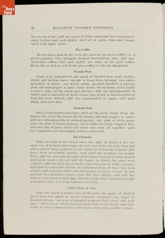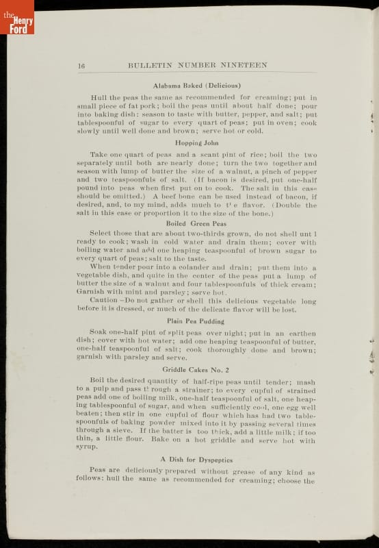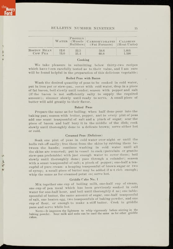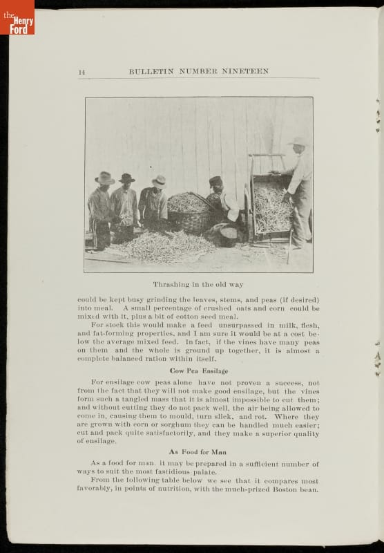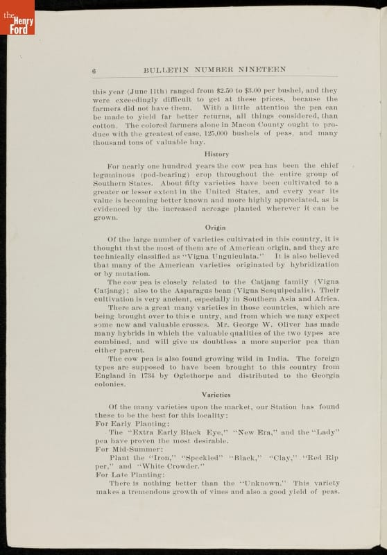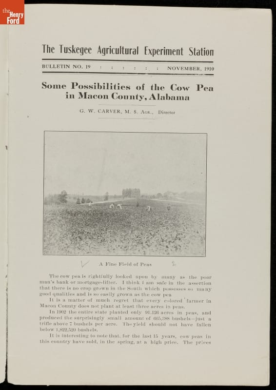 Among George Washington Carver's scientific contributions were the bulletins he issued from the Experiment Station of the Alabama state extension service that he established at the Tuskegee Institute. Carver wrote what he called "threefold" agricultural bulletins, with information for farmers, teachers, and housewives. This bulletin taught readers that cow peas were good for depleted soils as well as good to eat.