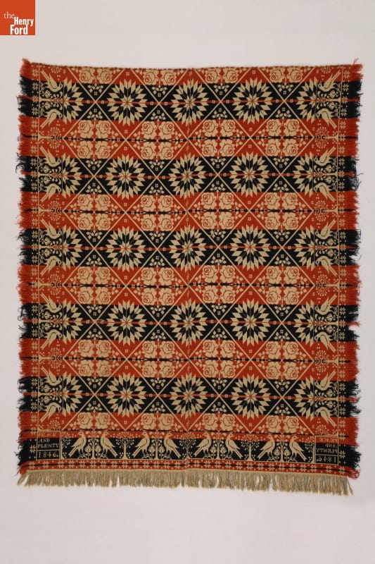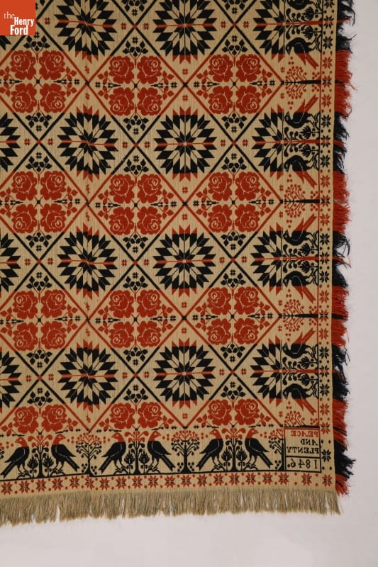 A coverlet is a decorative bedcovering--usually made of cotton and wool--woven on a loom. This "Peace and Plenty" coverlet expresses the optimism of a young America. This popular sentiment and the bird-and-bush Pennsylvania German border motif were used by a number of coverlet weavers, but were combined with different centerfield designs.