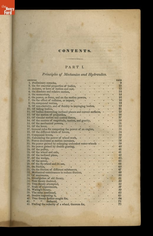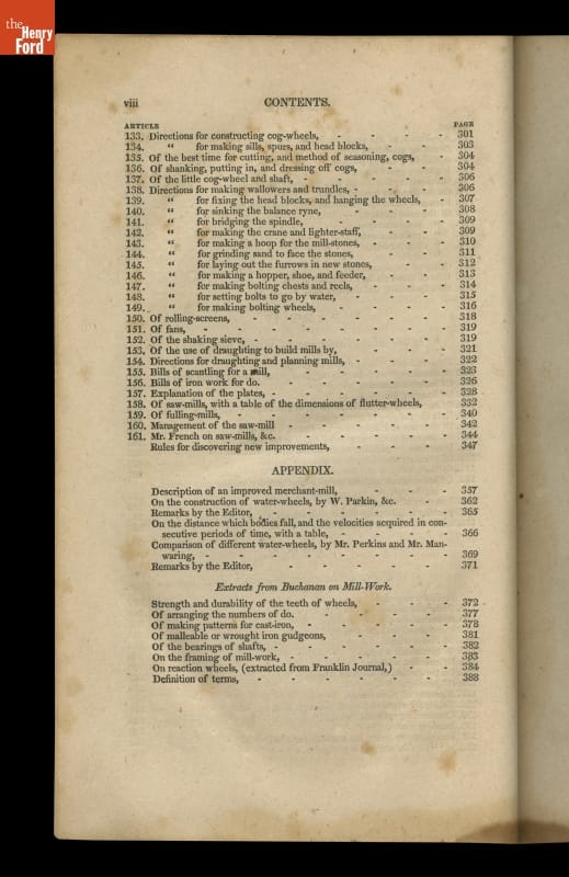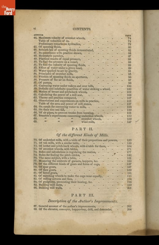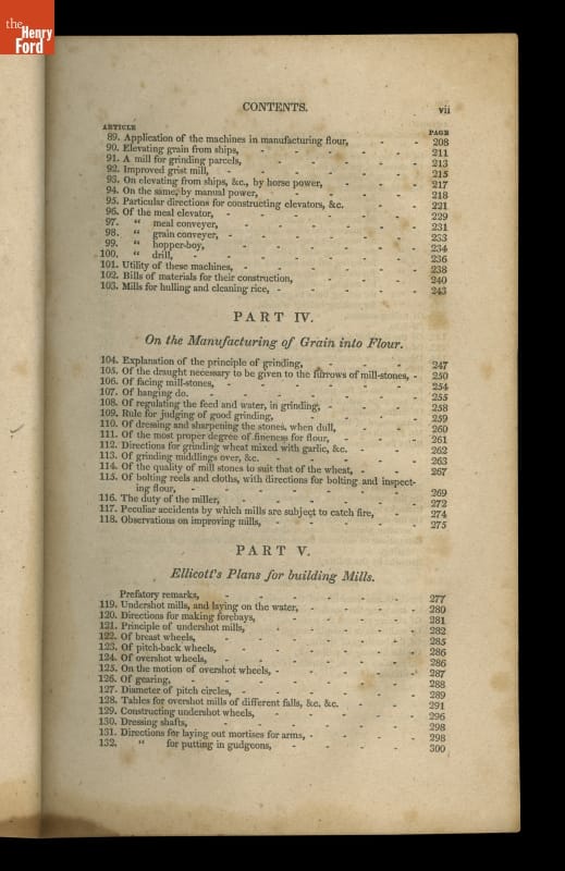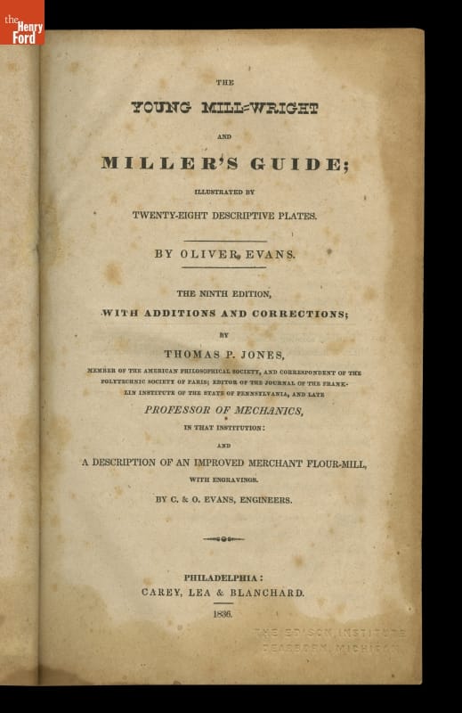 This instructional handbook was originally written and published by Oliver Evans (1755-1819). In the late 1700s, Evans developed a continuous conveyor system for milling flour. The Young Mill-Wright and Miller's Guide explained his labor-saving innovations through text and technical illustrations. Published in fifteen editions between 1795 and 1860, the influential book helped revolutionize the flour-milling industry.