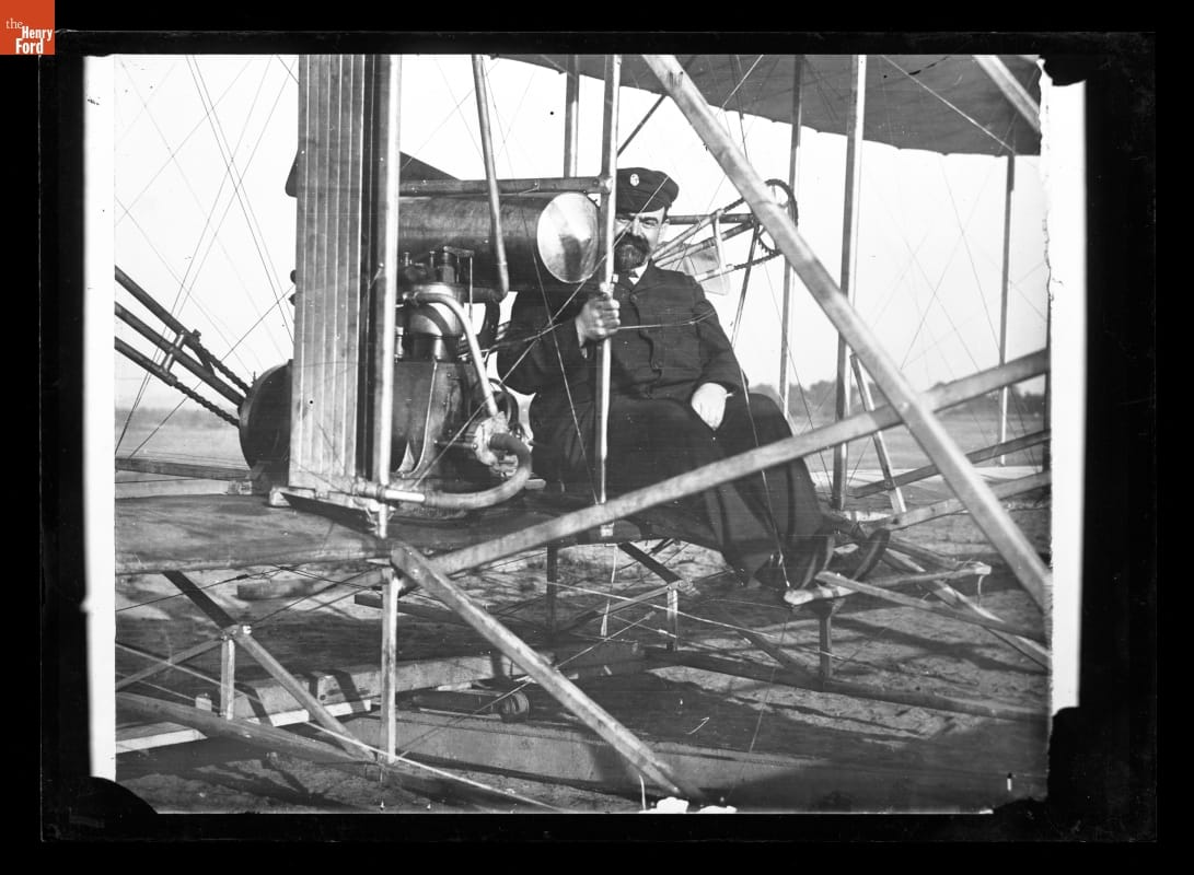 Leon Bollee Sitting at the Controls of the Wright Flyer at Camp d'Auvours, near Le Mans, France, 1908-1909