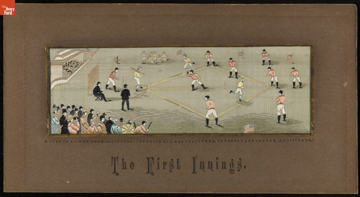 on front matte, under image: WOVEN IN SILK BY THOMAS STEVENS, INVENTOR AND MANUFACTURER, COVENTRY AND LONDON. (REGISTERED) / The First Innings. on back, title: The First Innings/ Date: 1880 (dated by Newgate St. address,/ 18 titles available and 10 medal awards/ on back label) on back, advertisement: .../ STEVENGRAPH PURE SILK WOVEN PICTURES / The following subjects can be had beautifully illuminated in 10 or 12 colors: / THE GOOD OLD DAYS (Royal Mail coach) / THE FIRST TRAIN. / TURPIN'S RIDE TO NEW YORK (The Toll-Gate Leap) / THE MEET (A hunting Scene)... / THE FIRST INNINGS (A Base-ball Match.) / ... / THOMAS STEVENS, Sole Inventor and Manufacturer.