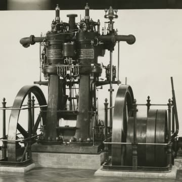 This photograph shows one of the earliest commercially produced diesel engines. Built in 1898 by Maschinenfabrik-Augsburg AG, a supporter of Rudolf Diesel and his engine, it was installed at a tool manufacturing company in Pforzheim, Germany. Agents for Henry Ford located and purchased the engine in 1929. The engine remains an important part of the museum's collection.