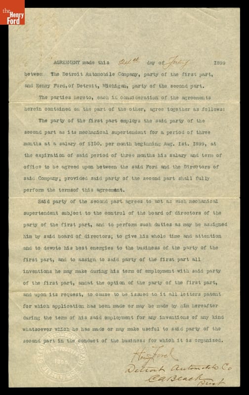 Agreement between Detroit Automobile Company and Henry Ford, 1899