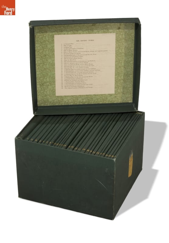 Henry and Clara Ford hired landscape architect Jens Jensen to design the grounds surrounding Fair Lane -- the Fords' 1300-acre Rouge River estate. Jensen created landscape drawings for his vision of the estate's formal and natural areas. Jensen numbered and stored these plans in this case.