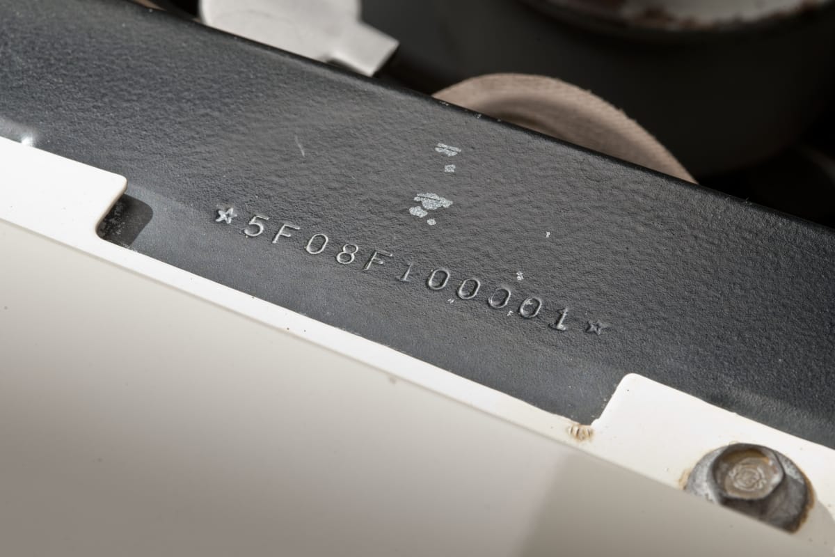 Stamped on the warranty plate, which is attached to the rear face of the left front door: BODY COLOR TRIM DATE DSO AXLE TRANS / 05C 81 5 F / VEHICLE WARRANTY NUMBER / 5F08F100001 Ford (R) / NOT FOR TITLE OR / REGISTRATION PURPOSES / THIS VEHICLE IS MANUFACTURED UNDER UNITED STATES / AND FOREIGN PATENTS AND PATENT APPLICATIONS / A PRODUCT OF Ford (R) MOTOR COMPANY / MADE IN U.S.A. Hubcaps: Mustang Behind front wheels on both sides of body: Mustang Front sides of body (behind headlights): 260 Edge of hood: FORD Rear: Ford Mustang emblem