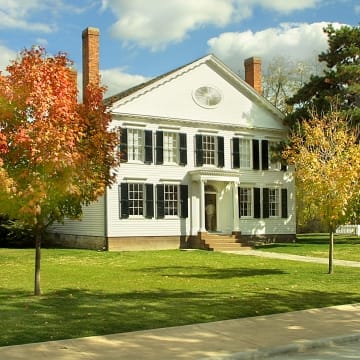 This is textbook pioneer and spelling reformer Noah Webster's home on its original site in New Haven, Connecticut. Henry Ford admired Webster and recognized his house as an important piece of American history. Ford had the building moved to Greenfield Village - his historical outdoor museum in Dearborn, Michigan. This view documents architectural details, including second floor bay windows not moved with the house.