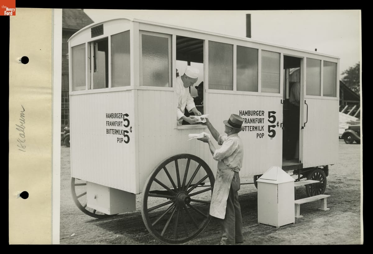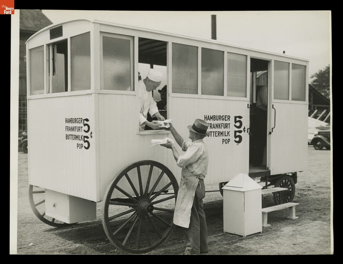 Serving Food from the Owl Night Lunch Wagon in Greenfield Village, 1935