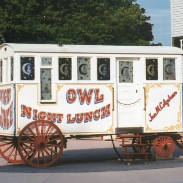 Night lunch wagons became popular in the 1890s. These horse-drawn "restaurants on wheels" served simple, affordable food like hot dogs after regular restaurants closed for the night. The Owl Night Lunch wagon pictured here operated in Detroit until 1926, when a city ordinance banned lunch wagons. Henry Ford, who had patronized the Owl as a young engineer, acquired it for Greenfield Village in 1927.