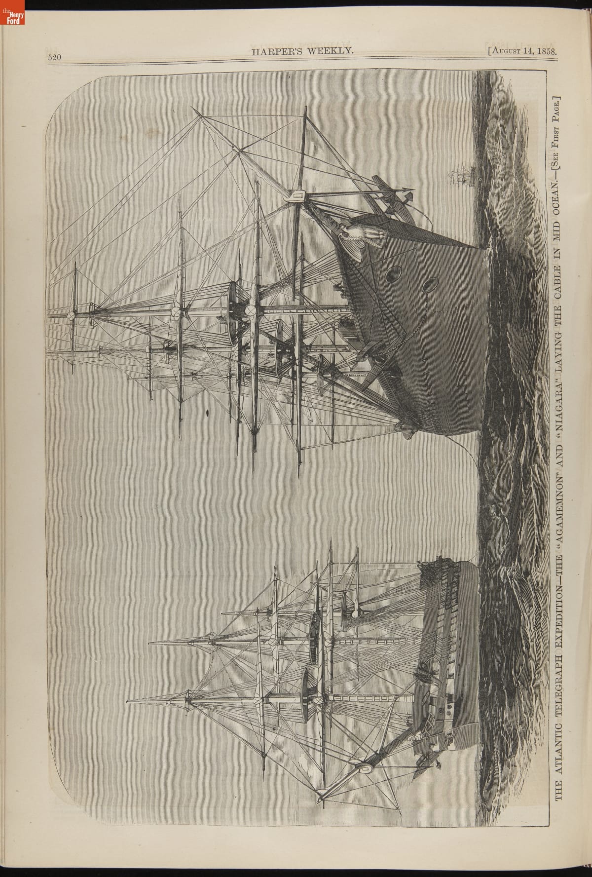 This periodical shows a fire at New York City Hall on August 18, 1858. To celebrate the successful transmission of messages over the transatlantic cable September 1 was declared as an "International Cable Jubilee" day. New York City began its commemorations early, setting off a display of fireworks. Sparks ignited the dome of City Hall, destroying part of the building.