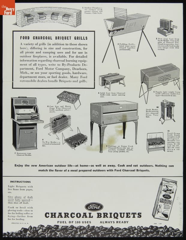 Ford Motor Company manufactured charcoal briquettes from wood wastes generated by its lumber operations in Michigan's Upper Peninsula. To help promote the briquettes, Ford also sold charcoal grills through its auto dealerships and employee commissaries, as well as traditional hardware and sporting goods stores. Charcoal provided picnickers with a quick-burning fuel that eliminated the work of gathering and lighting firewood.
