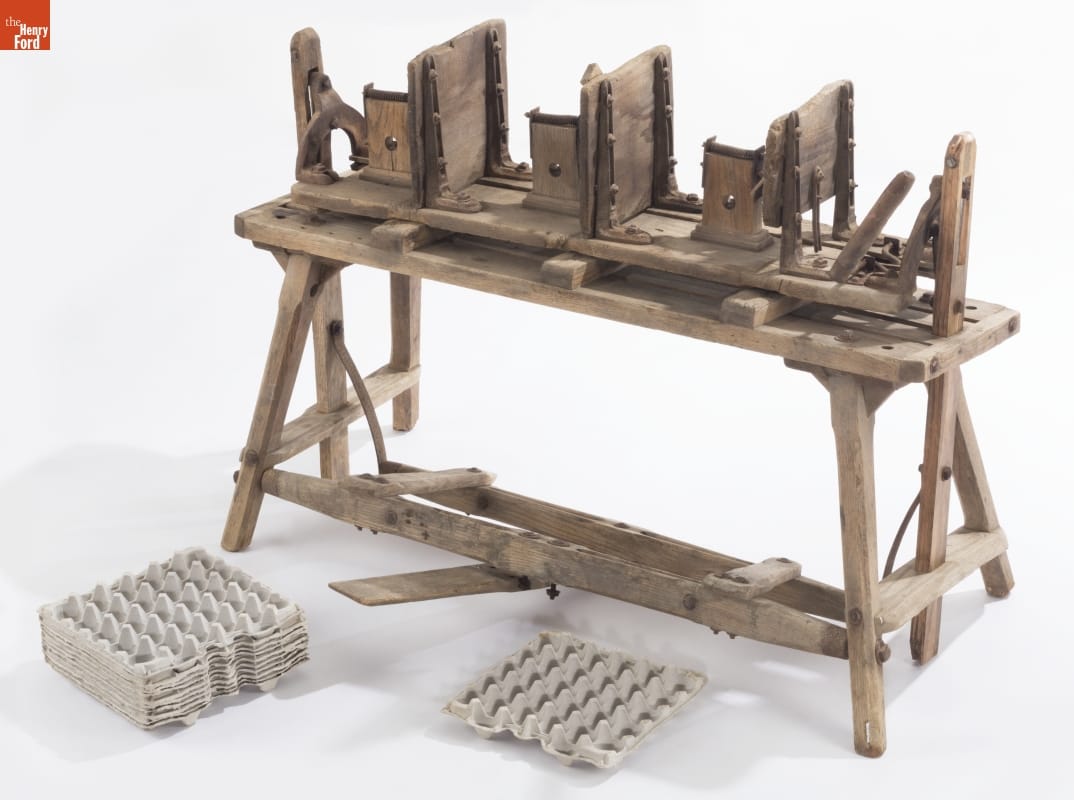 Civil War veteran James K. Ashley patented this machine in 1896. Egg farmers used it to build uniform boxes that held 360 eggs each. Farmers clamped wood boards between the vices, and then nailed the sides, middle and bottom together to complete a box. They stenciled finished boxes with the farm name and other advertising before shipping their eggs to urban markets.